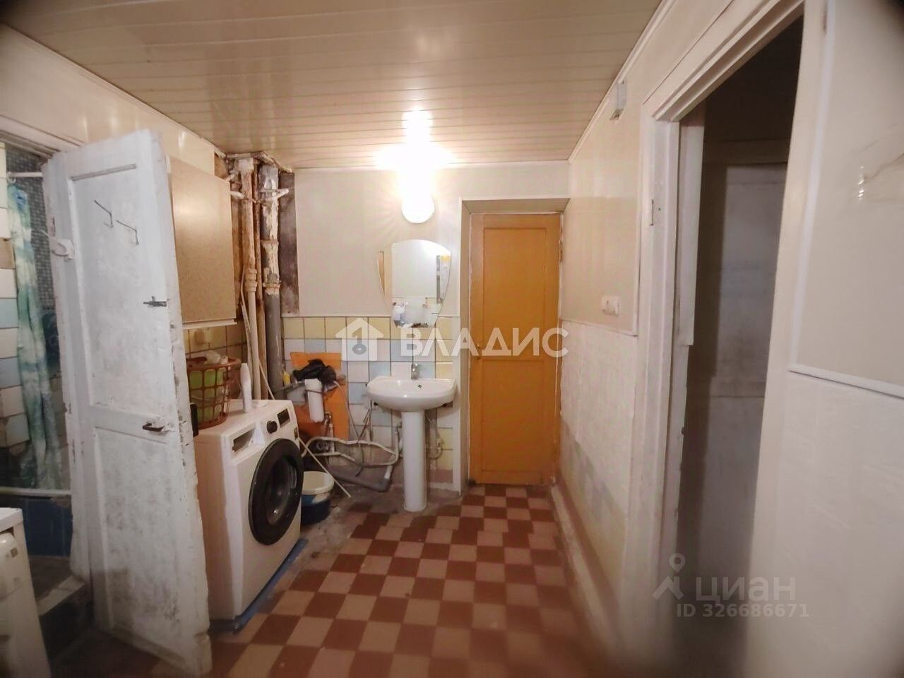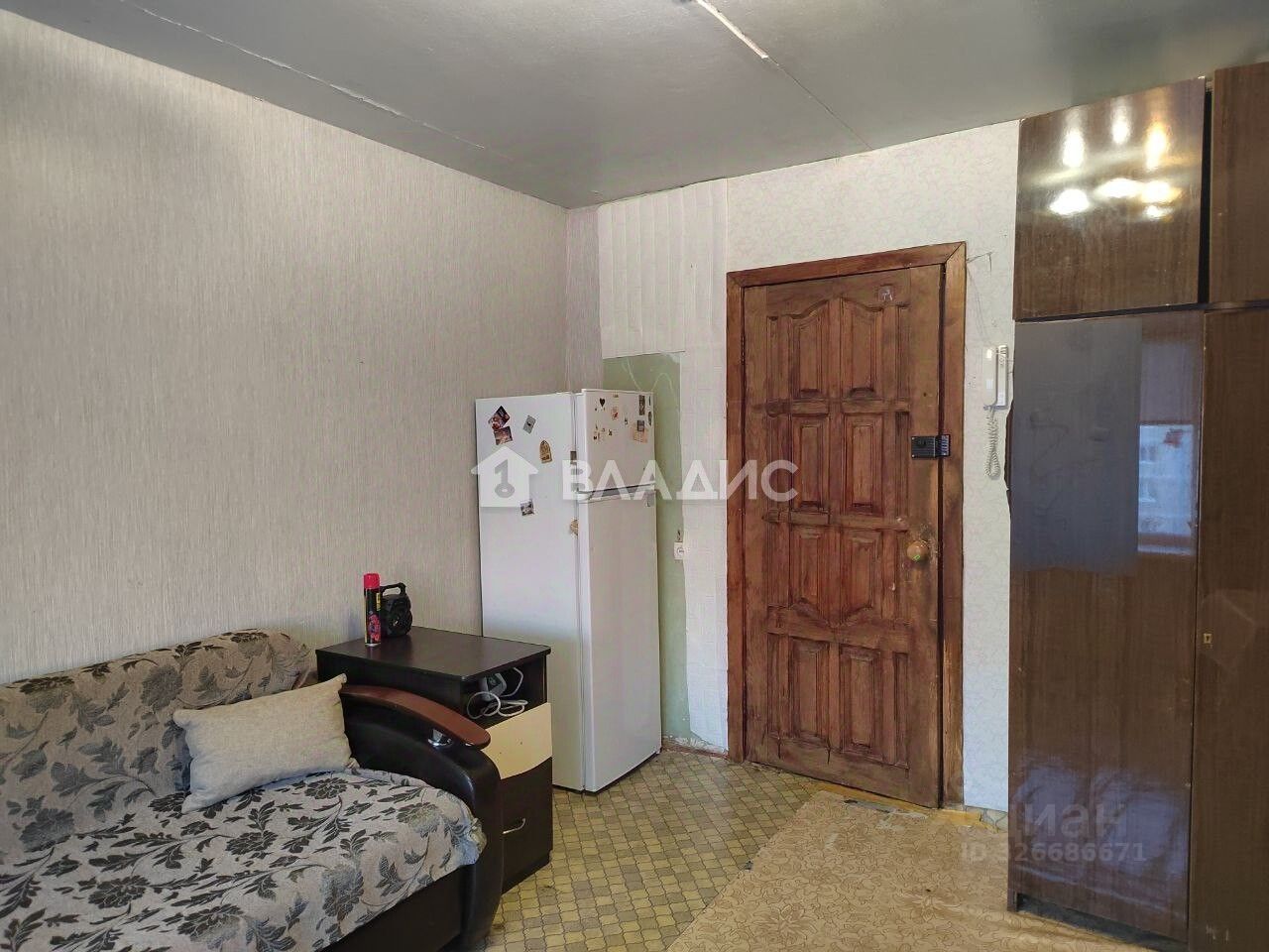 В комнате имеется диван, шкаф, холодильник, телевизор, стиральная машина.