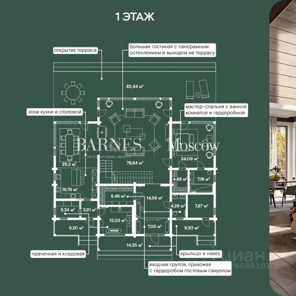 Дом состоит из 2 этажей. На первом этаже расположены: прихожая, техническое помещение, санузел, спальня с гардеробом и санузлом и гостиная. Также есть гардеробная, постирочная комната, столовая, кухня и терраса.