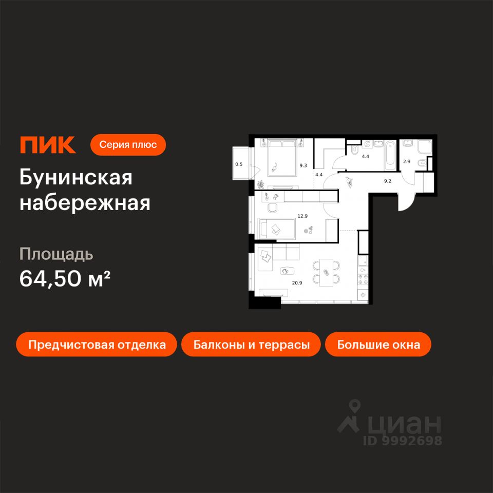 Продаётся 2-комн. квартира площадью 64,5 кв.м на 14 этаже 16 этажного дома (Корпус 2.6/1.2, Секция 2) проекта ПИК Бунинская набережная. Светлый просторный подъезд на уровне земли, функциональная планировка, большие окна, предчистовая отделка.