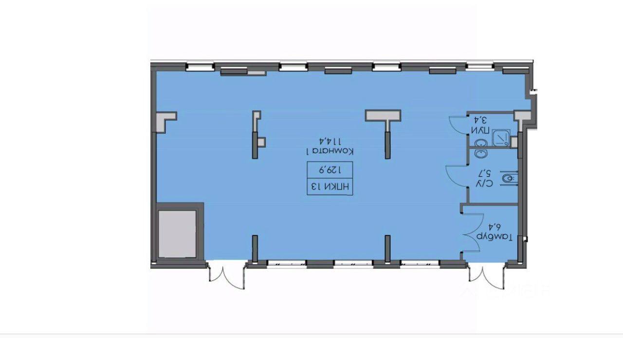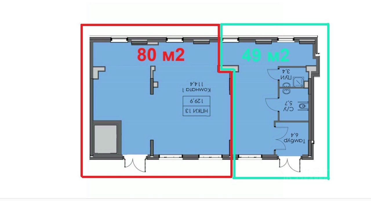 Общая площадь помещения 129,9 м2,благодаря двум входным группам с фасада, есть возможность деления на два блока: 80 и 30 м2 соответственно.