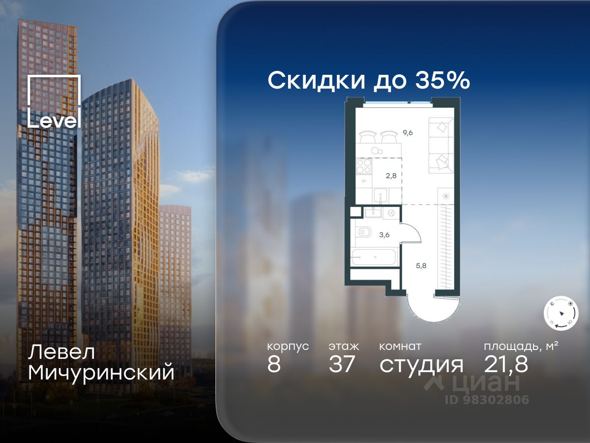 В жилом квартале, расположенном на границе с природным заказником ''Долина реки Очаковки'', продаётся студия площадью 21.80 кв.м без отделки. Квартира расположена на 37 этаже 48-этажного корпуса 8 в жилом комплексе бизнес-класса Левел Мичуринский (компания Level Group/Левел групп).