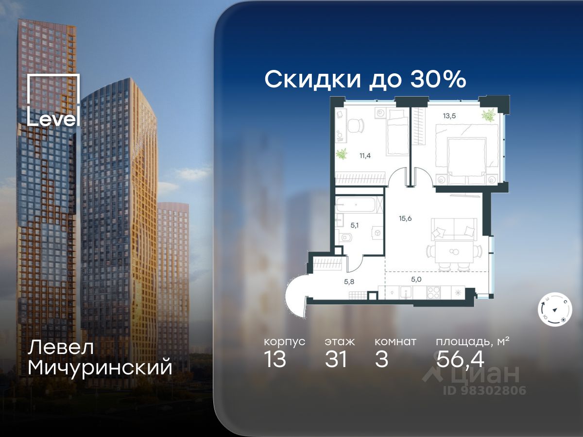 В жилом квартале, расположенном на границе с природным заказником ''Долина реки Очаковки'', продаётся 3-комнатная квартира площадью 56.40 кв.м без отделки. Квартира расположена на 31 этаже 31-этажного корпуса 13 в жилом комплексе бизнес-класса Левел Мичуринский (компания Level Group/Левел групп).
