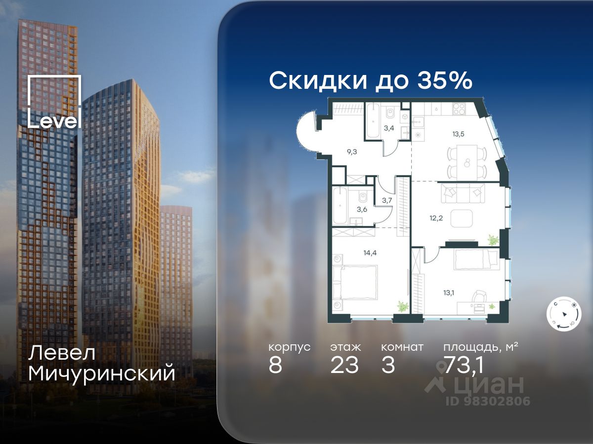 продам 3-к, Левел Мичуринский ЖК, 848 294 623 ₽