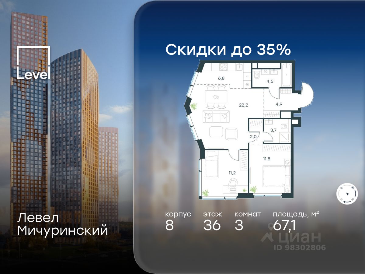 продам 3-к, Левел Мичуринский ЖК, 834 224 311 ₽