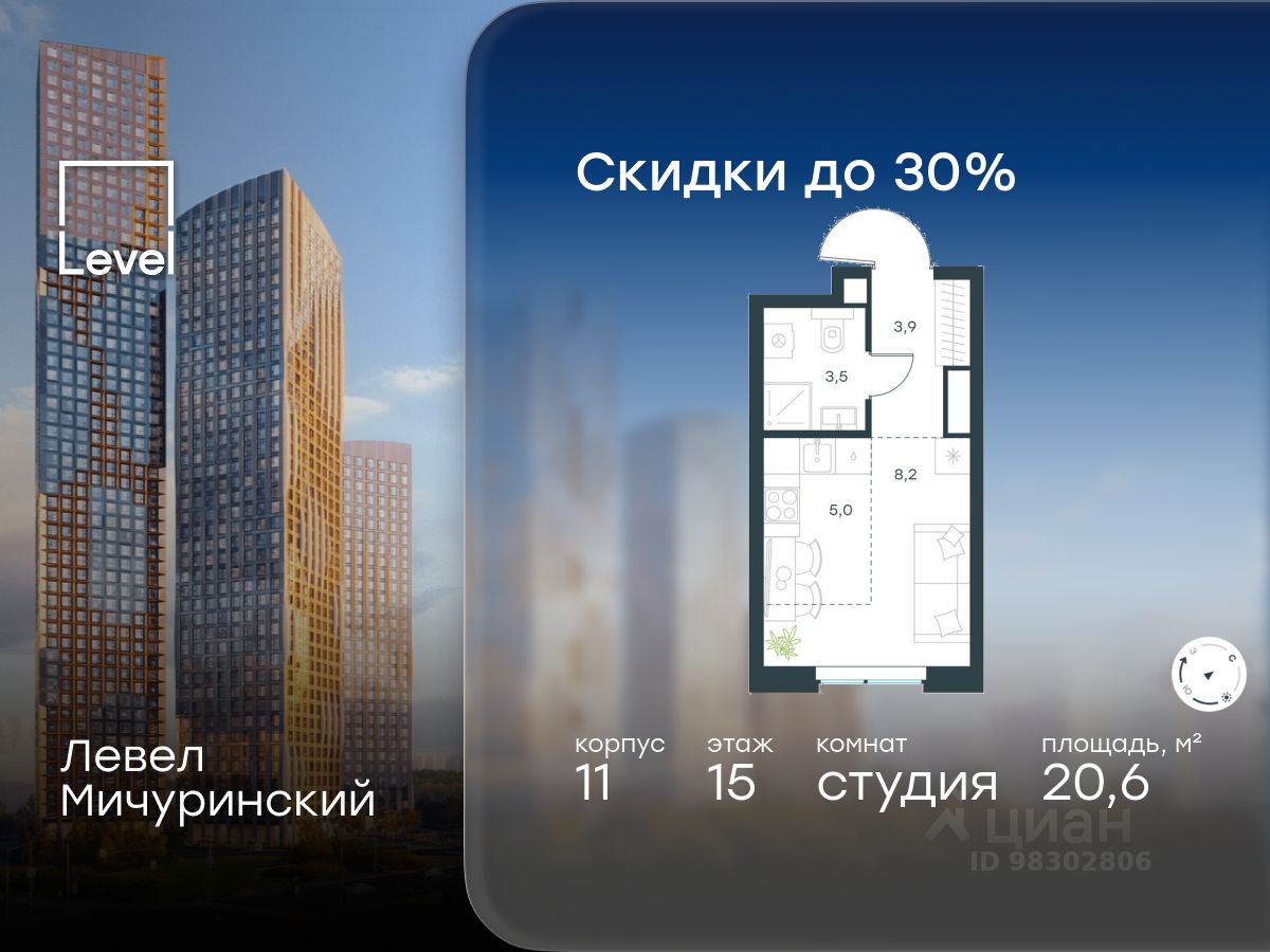 продам 1-к, Левел Мичуринский ЖК, 1117 390 618 ₽