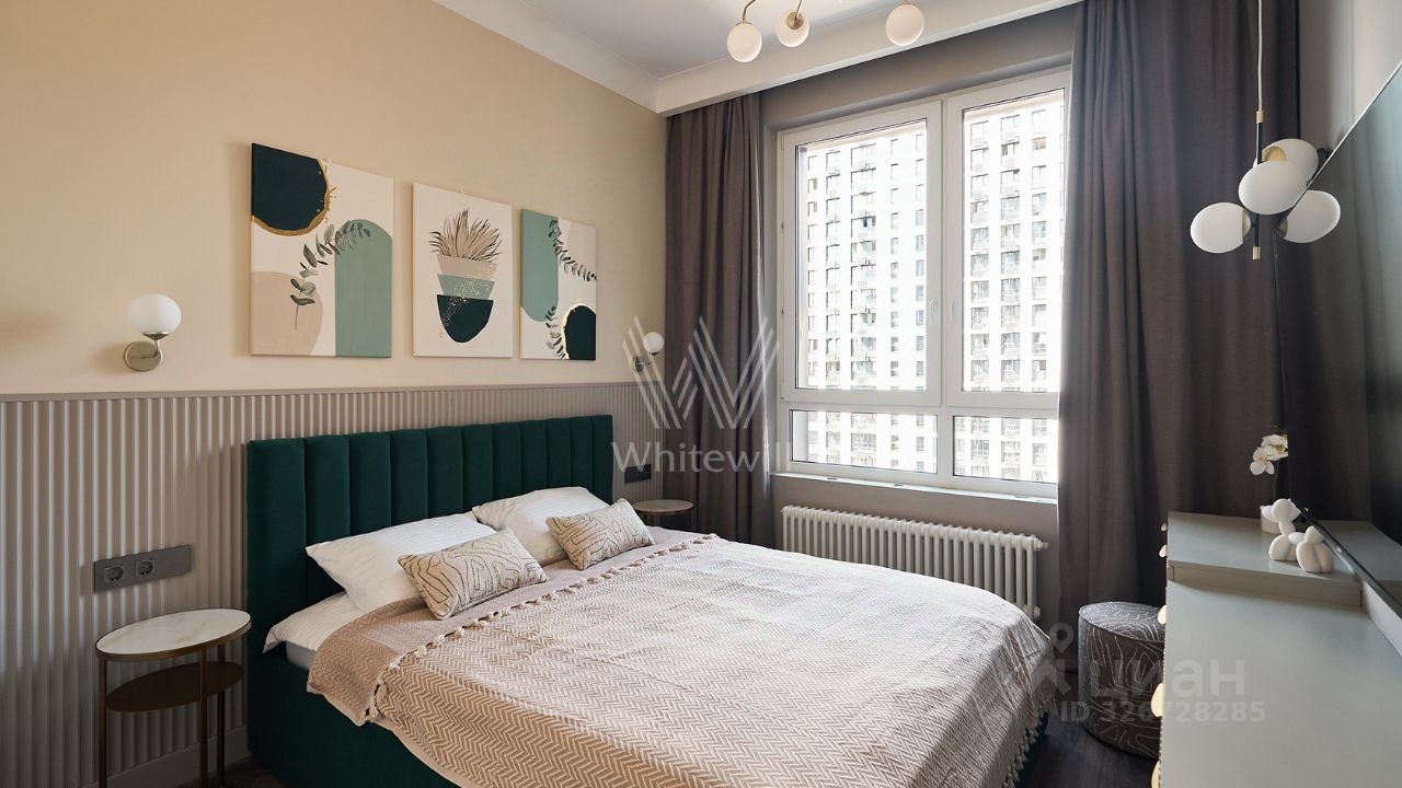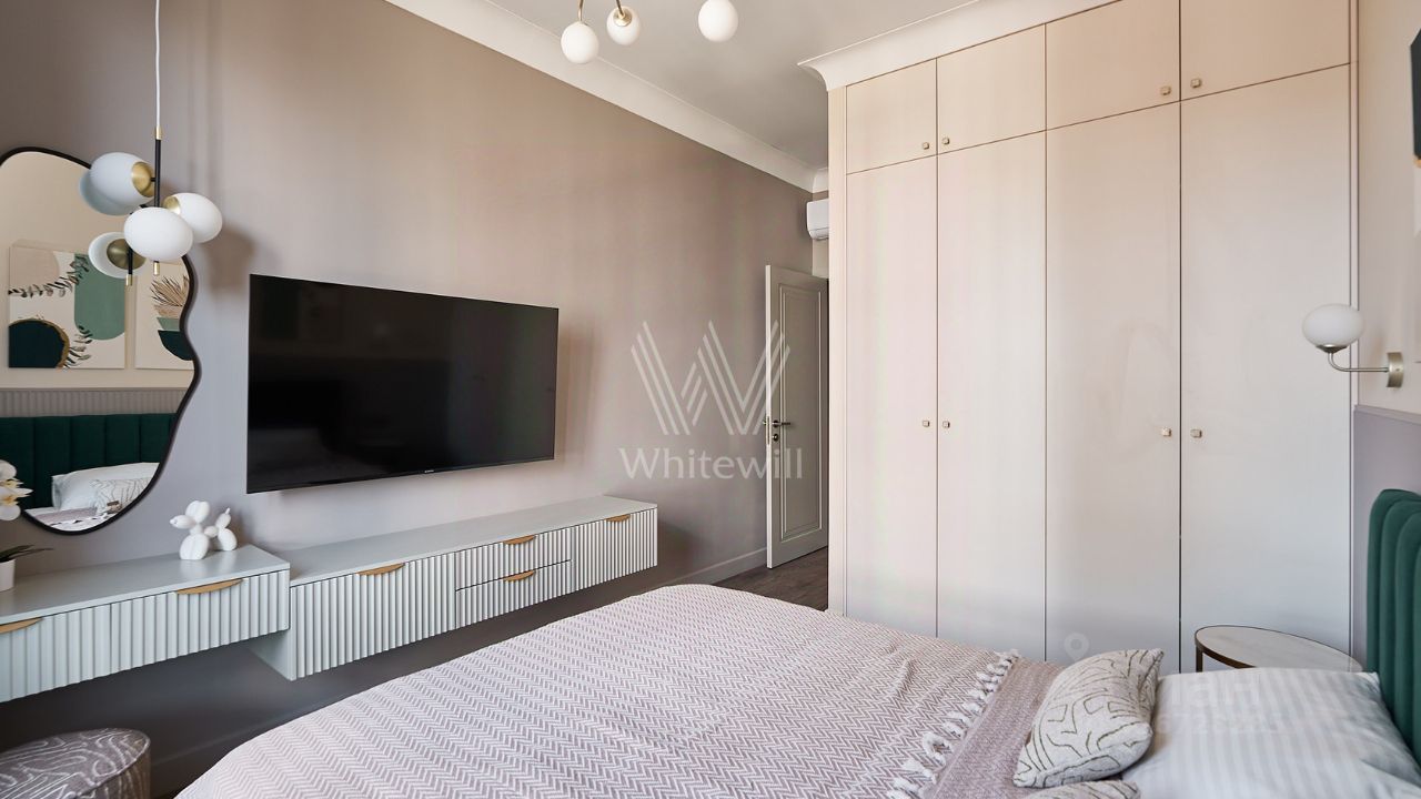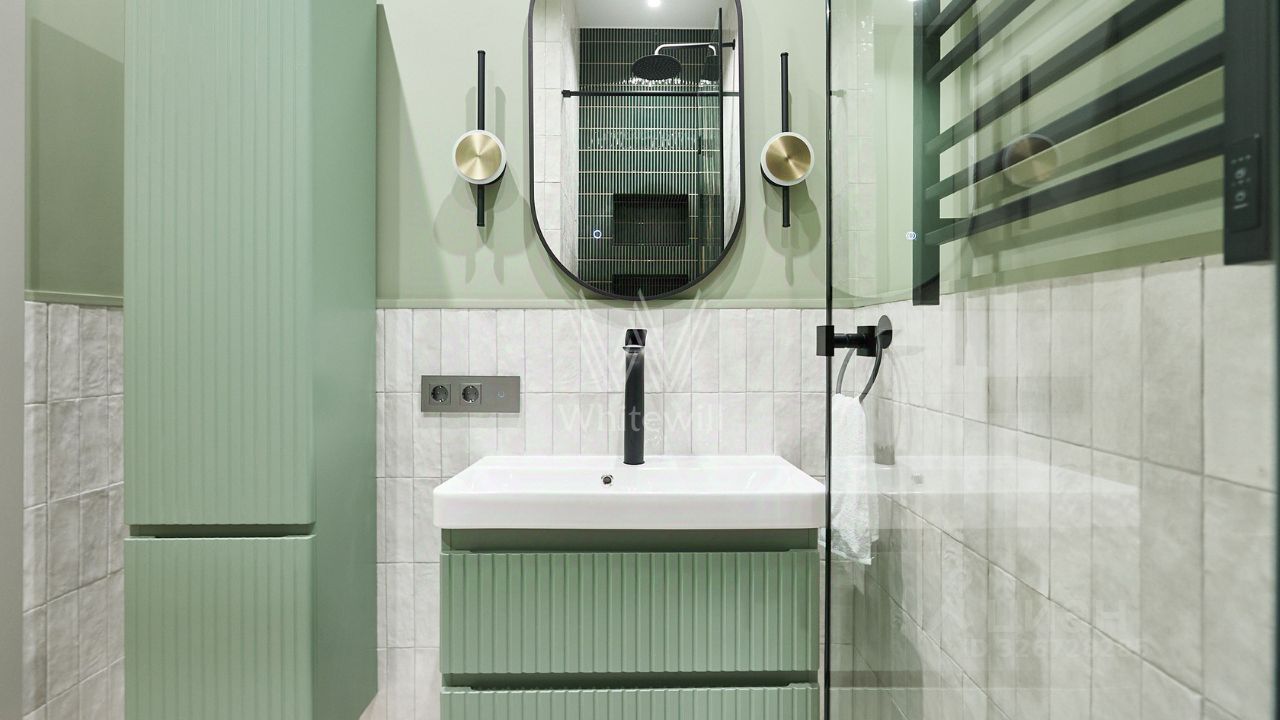 Уютная квартира с 1-й спальней общей площадью 38 м² в комплексе бизнес-класса ''Вереск''. Выполнен новый дизайнерский ремонт в неоклассическом стиле в пастельных тонах. Панорамное окно в гостиной наполняет пространство естественным светом. Окна выходят в тихий двор. Спланирована кухня-гостиная с раскладным диваном, изолированная спальня с вместительным шкафом, гардеробная с постирочной зоной, санузел с душевой, прихожая с гардеробной у входа.