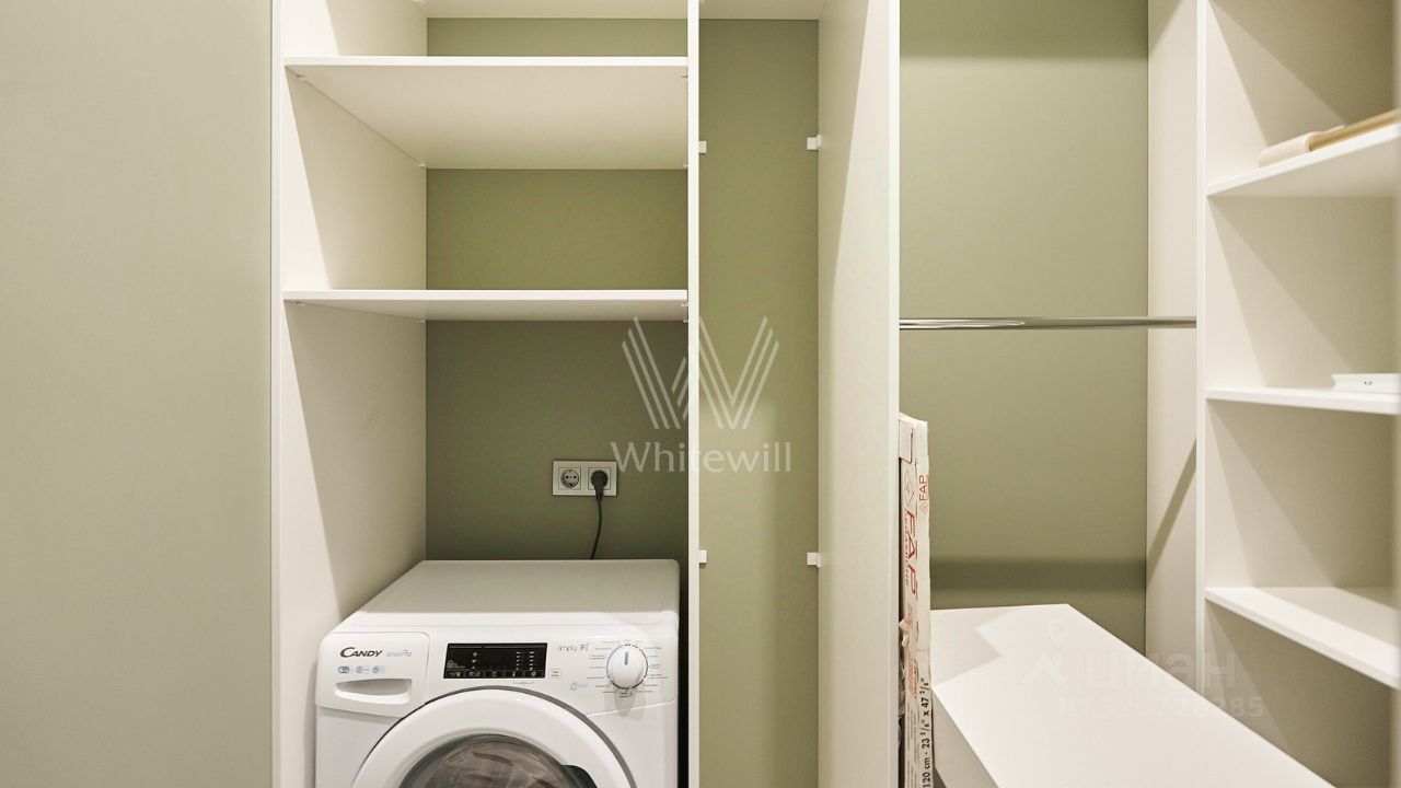 Квартира полностью укомплектована мебелью и бытовой техникой Weissgauff, включая микроволновку и духовой шкаф. Кухня оснащена фильтром для питьевой воды, измельчителем для пищевых отходов, индукционной плитой и подходящей для неё посудой.