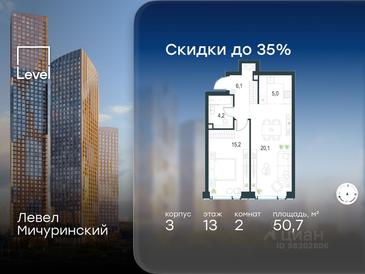 В жилом квартале, расположенном на границе с природным заказником ''Долина реки Очаковки'', продаётся 2-комнатная квартира площадью 50.70 кв.м с отделкой white box. Квартира расположена на 13 этаже 30-этажного корпуса 3 в жилом комплексе бизнес-класса Левел Мичуринский (компания Level Group/Левел групп).