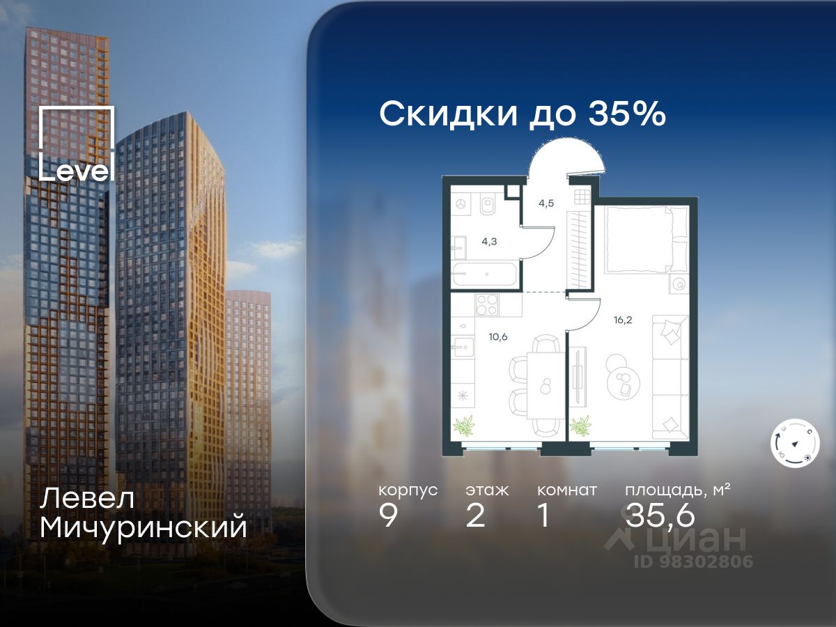 В жилом квартале, расположенном на границе с природным заказником ''Долина реки Очаковки'', продаётся 1-комнатная квартира площадью 35.60 кв.м без отделки. Квартира расположена на 2 этаже 12-этажного корпуса 9 в жилом комплексе бизнес-класса Левел Мичуринский (компания Level Group/Левел групп).