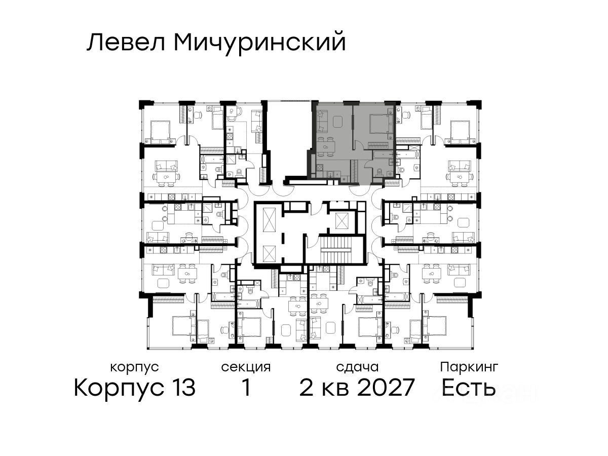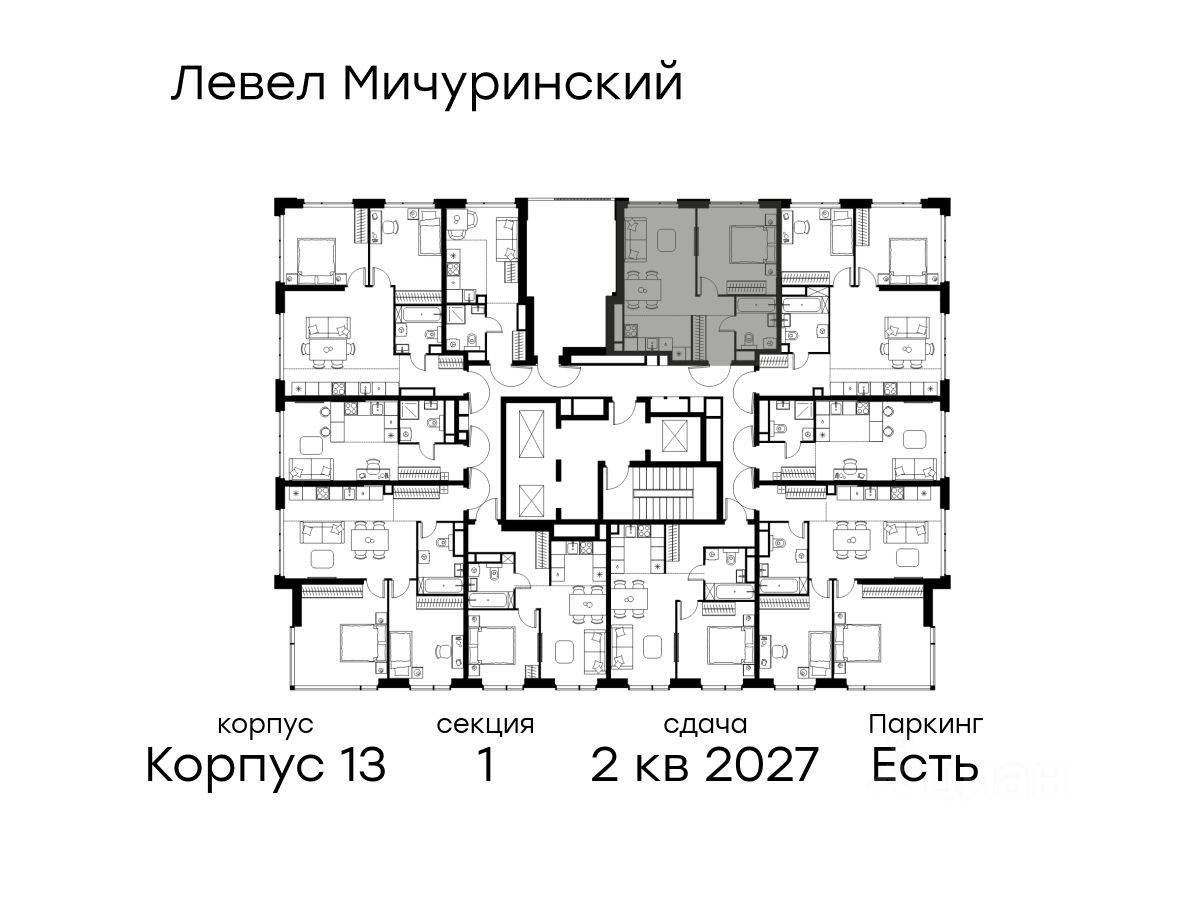 В жилом квартале, расположенном на границе с природным заказником ''Долина реки Очаковки'', продаётся 2-комнатная квартира площадью 44.20 кв.м без отделки. Квартира расположена на 16 этаже 31-этажного корпуса 13 в жилом комплексе бизнес-класса Левел Мичуринский (компания Level Group/Левел групп).