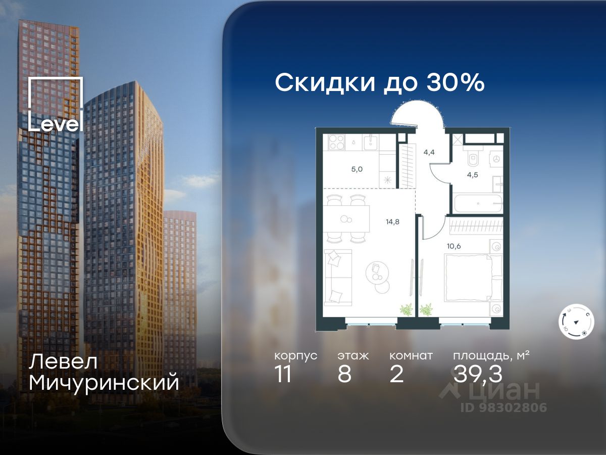 продам 2-к, Левел Мичуринский ЖК, 1123 985 949 ₽