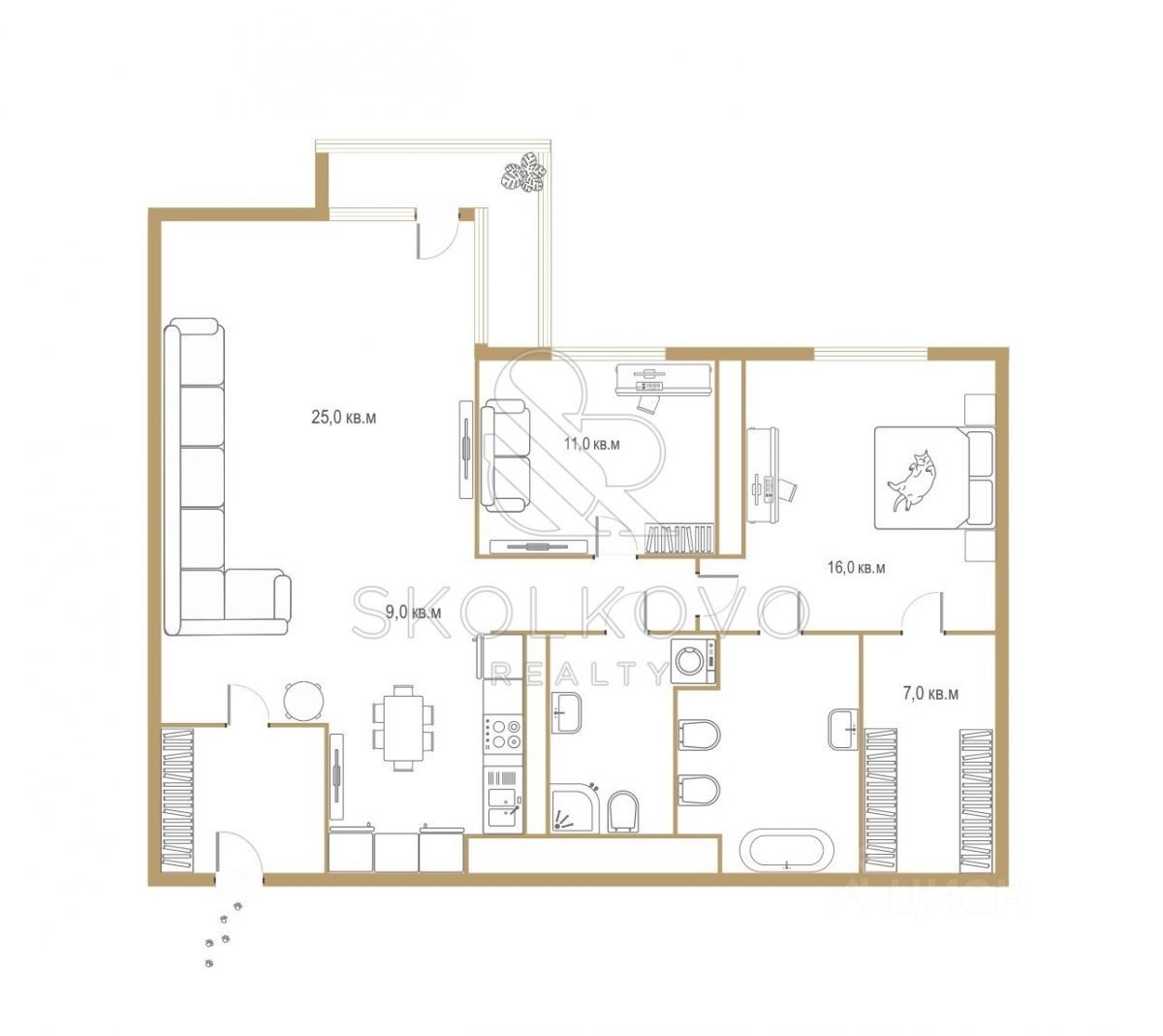 Внутренняя планировка включает в себя: Просторную спальню с гардеробной комнатой и собственным санузлом. Светлую кухню, которая плавно переходит в гостиную с выходом на балкон, идеально подходящую для вечера с друзьями. Комнату свободного назначения, которая может быть обустроена как дополнительная спальня или кабинет.
