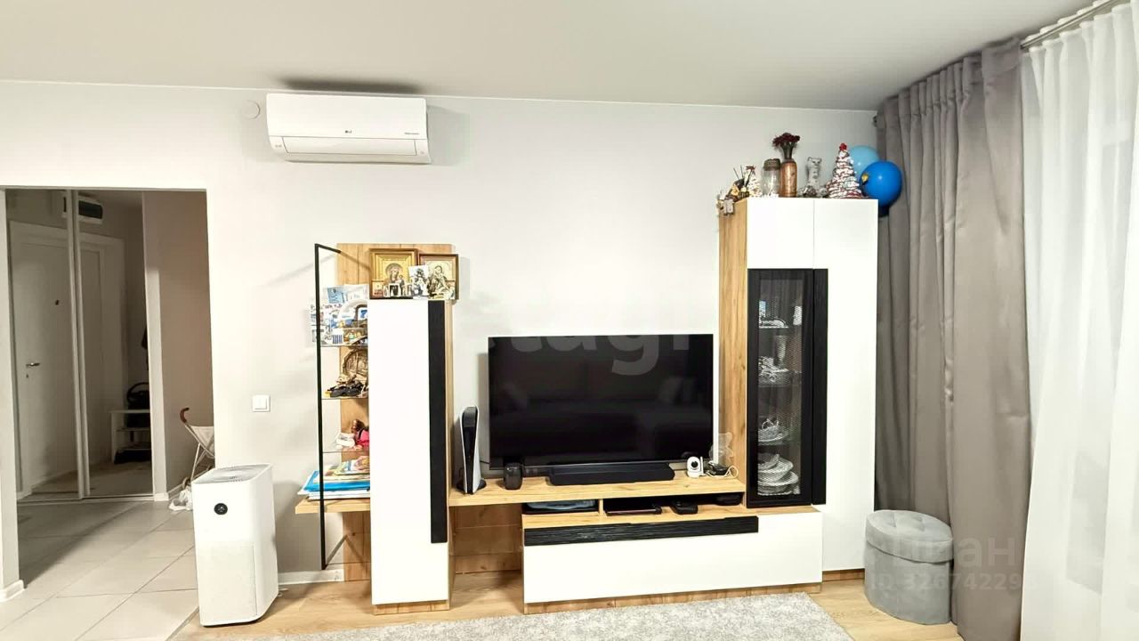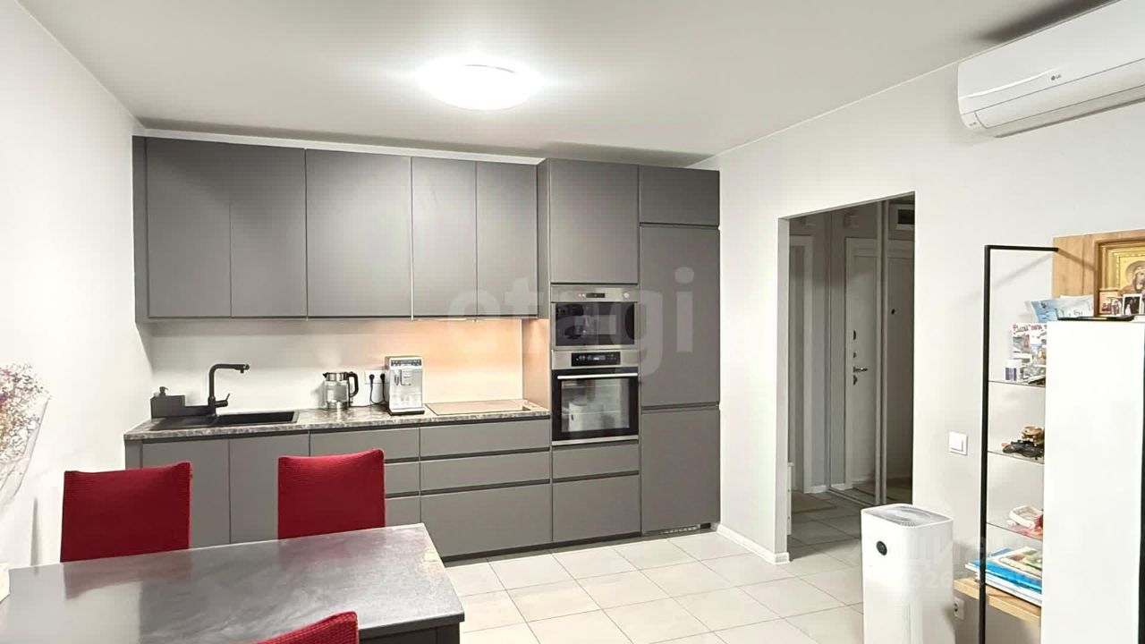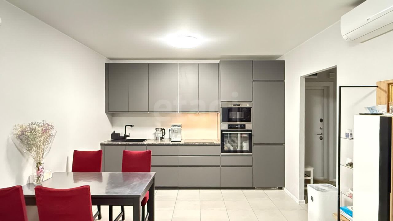 Дополнительными преимуществами являются два санузла и просторная прихожая. Объект находится в отличном состоянии и полностью укомплектован для заселения: встроенная кухня, качественная мебель, бытовая техника и система кондиционирования.