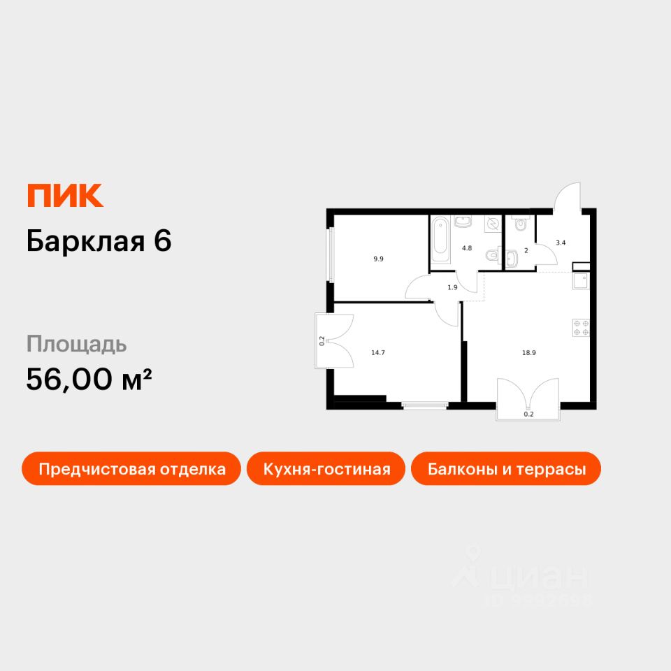 Продаётся 2-комн. квартира площадью 56 кв.м на 2 этаже 32 этажного дома (Корпус 8, Секция 3) проекта ПИК Барклая 6. Светлый просторный подъезд на уровне земли, функциональная планировка, большие окна, предчистовая отделка.