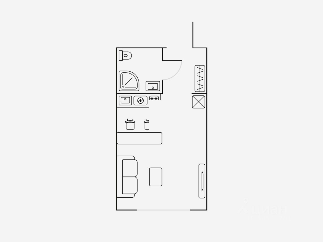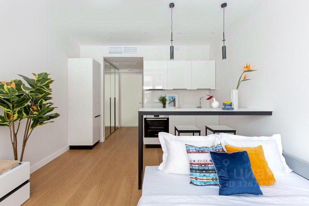 В квартире размещён полный комплект необходимой мебели: - современный кухонный гарнитур, - барная стойка со стульями на две персоны, - двуспальный раскладной диван, - вместительный шкаф.