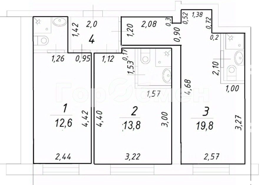 Высокий первый этаж 14-ти этажного дома. Студия 1 на схеме. Площадь 12,6 кв.м, санузел совмещенный, выводы под кухню, установлены счетчики на воду и электроэнергию. Окна выходят во двор. Во дворе всегда в наличии места для парковки.