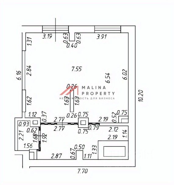 Помещение 63 м2, располагается на 1 этаже, открытая планировка, отдельный вход с фасада, высота потолка 4,9 м, витринные окна по фасаду. Электрическая мощность 20 кВт. Место для размещения рекламы.