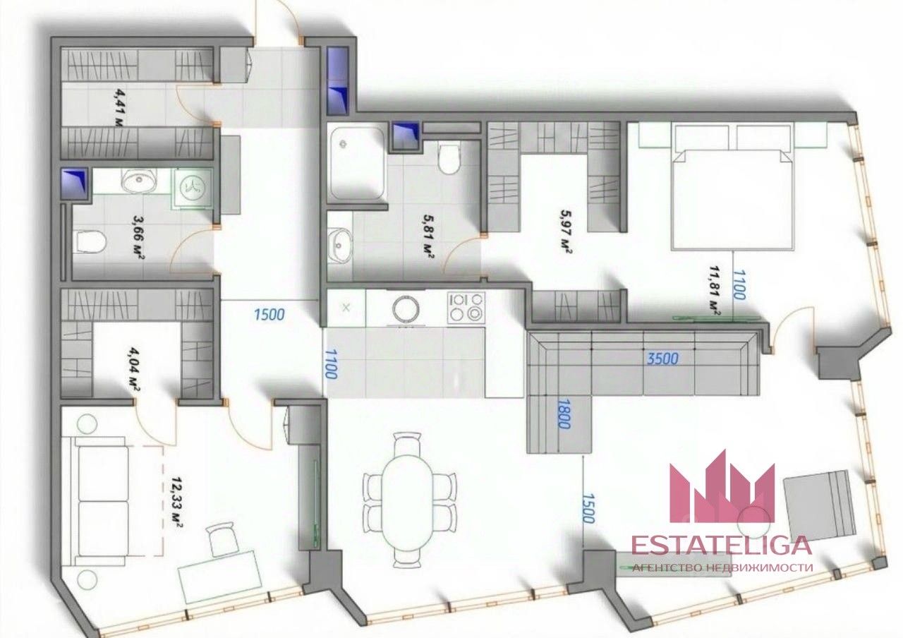Планировка: Евро-3 с большой кухней-гостиной простор и гибкость для любой семьи Панорамные окна в пол — виды на Москва-Сити и вечерние огни