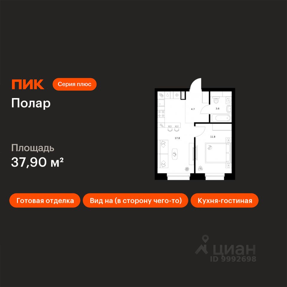 Продаётся 1-комн. квартира площадью 37,9 кв.м на 37 этаже 45 этажного дома (Корпус 1.4, Секция 1) проекта ПИК Полар. Светлый просторный подъезд на уровне земли, функциональная планировка, большие окна, c отделкой.