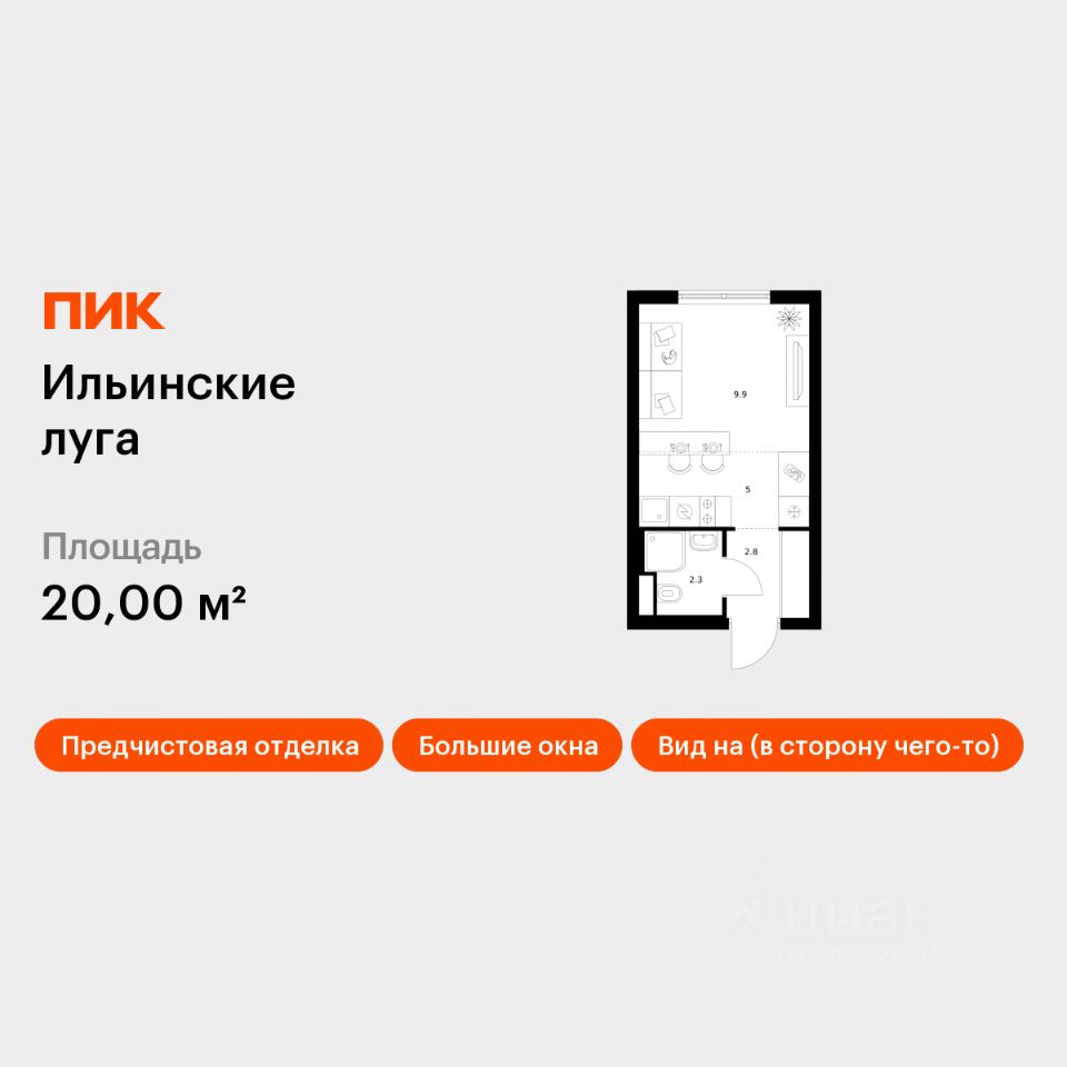 Продаётся квартира-студия площадью 20 кв.м на 9 этаже 9 этажного дома (Корпус 3.1, Секция 1) проекта ПИК Ильинские луга. Светлый просторный подъезд на уровне земли, функциональная планировка, большие окна, предчистовая отделка.