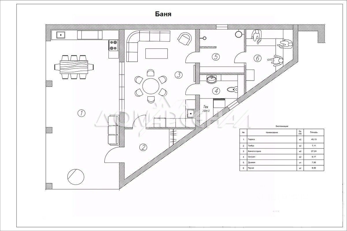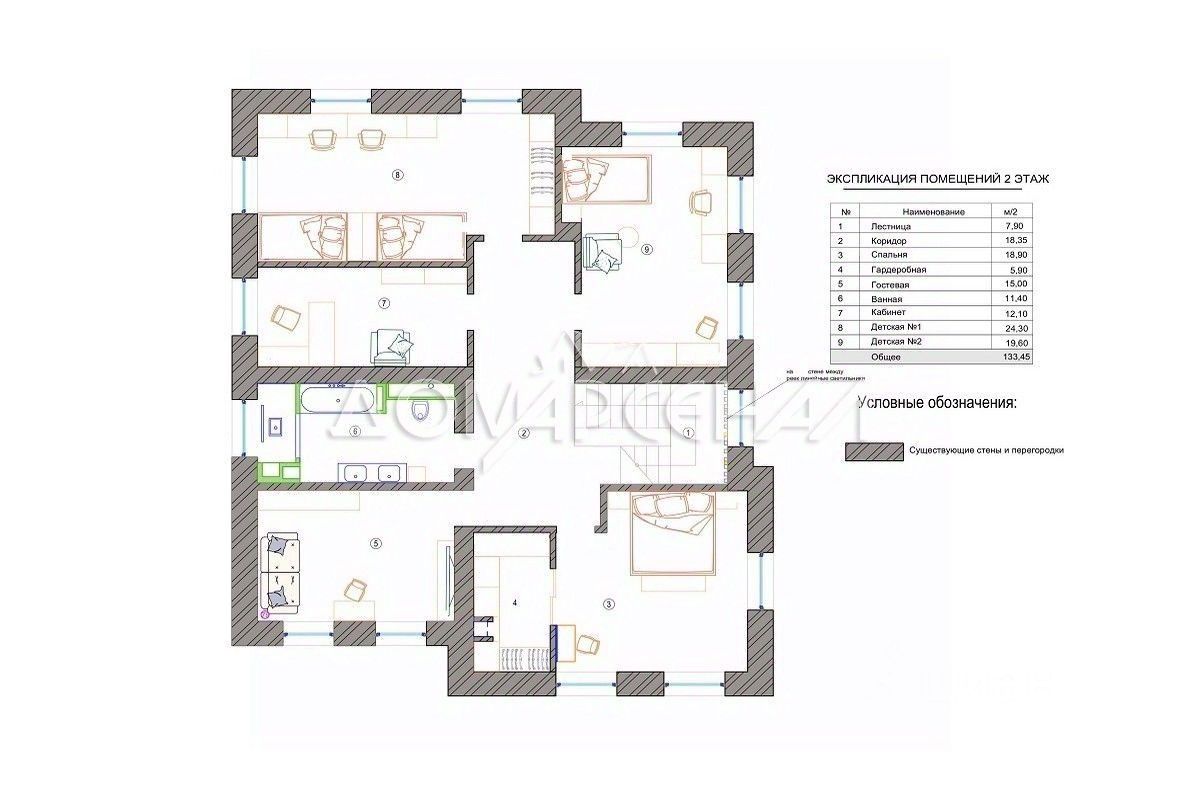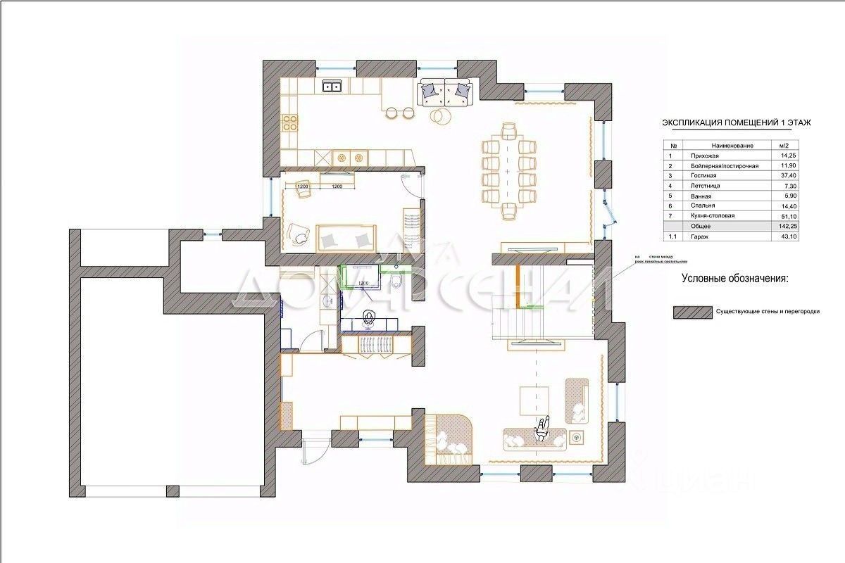 Планировка: 1 этаж: прихожая, гостиная с ТВ зоной, спальня (14,5 кв. м), санузел с душевой, кухня-гостиная (51 кв. м) с выходом на террасу, бойлерная с постирочной, гараж на 2 места 2 этаж: мастер спальня с гардеробной, три спальни, кабинет, ванная, холл