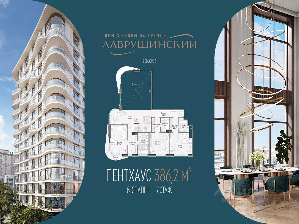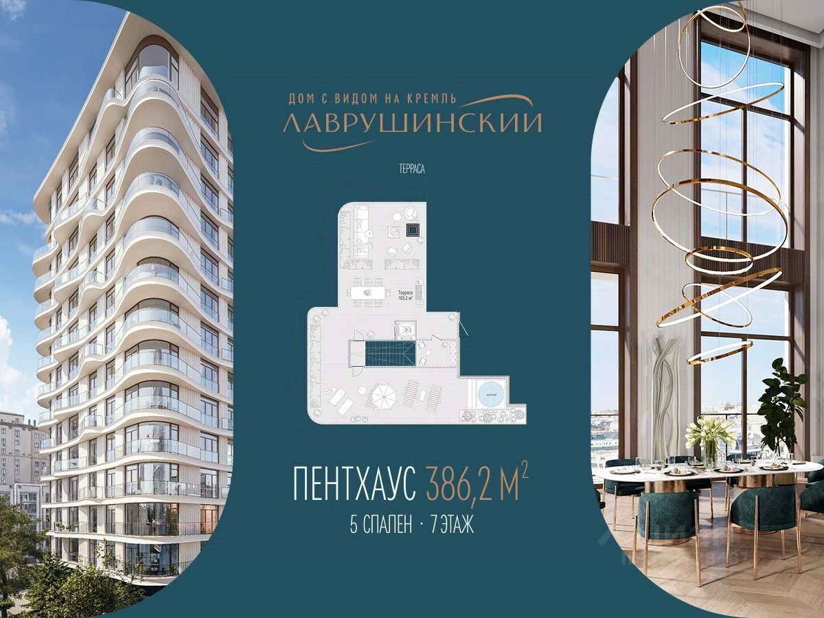 Двухэтажный пентхаус площадью 386 м² с террасой, вторым светом и прямыми видами на Кремль в центральном корпусе дома ''Лаврушинский'' . Пентхаус - редкий, коллекционный и самый дорогой формат жизни для тех, кто ценит высоту и простор для взгляда.