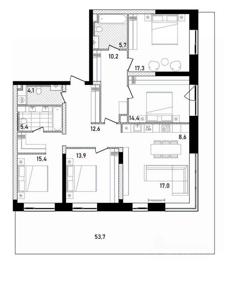 2 мастер спальни с собственной ванной и гардеробной. 2 отдельные спальни. Кухня-гостиная с угловым окном. Гостевой санузел.