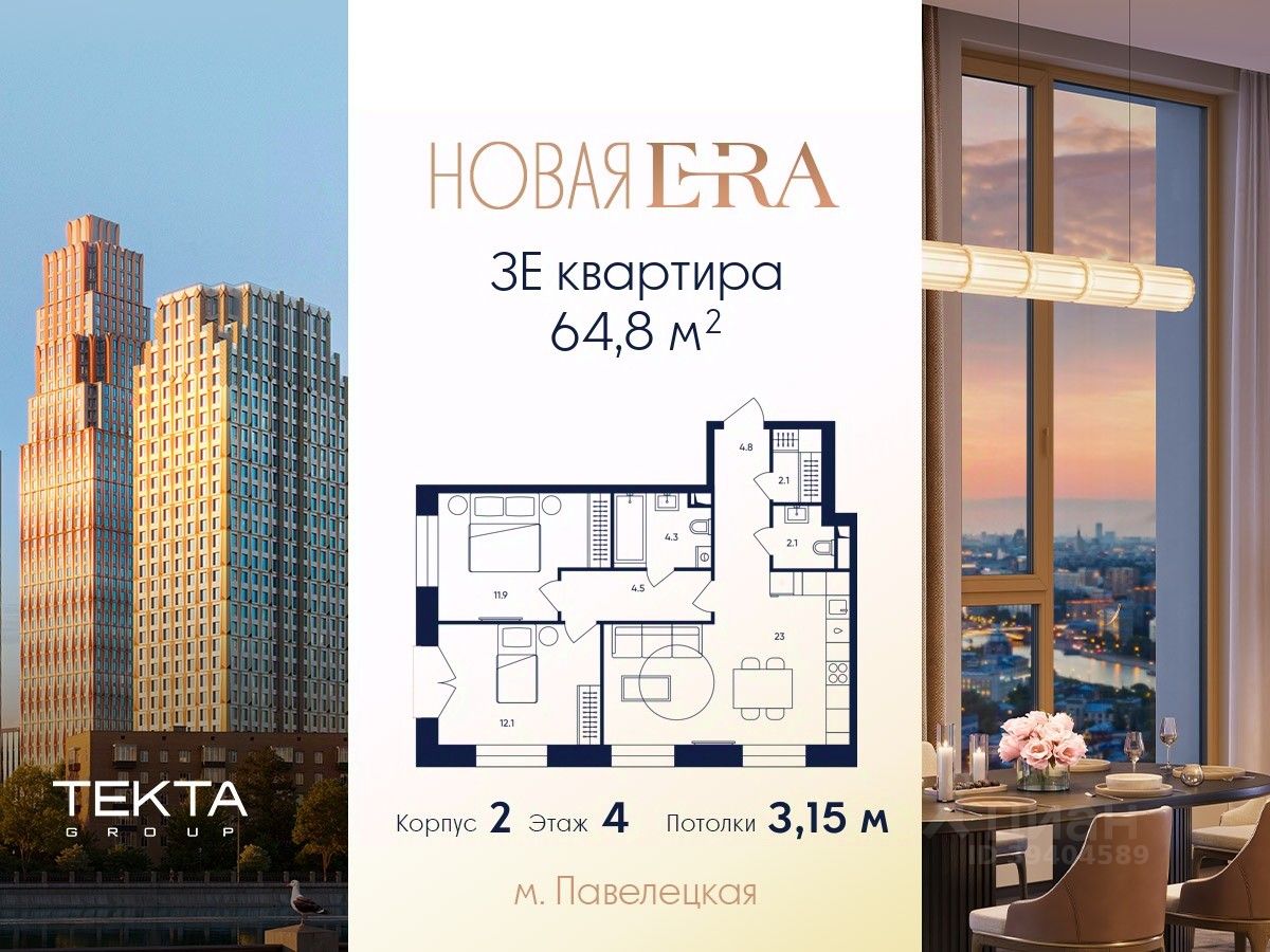 3-комн. квартира в ЖК ''Era'' на 4 этаже в 33 этажном здании Корпус 2. Общая площадь: 64.8 кв.м., жилая: 38.30 кв.м. Высота потолков 3.15 м.