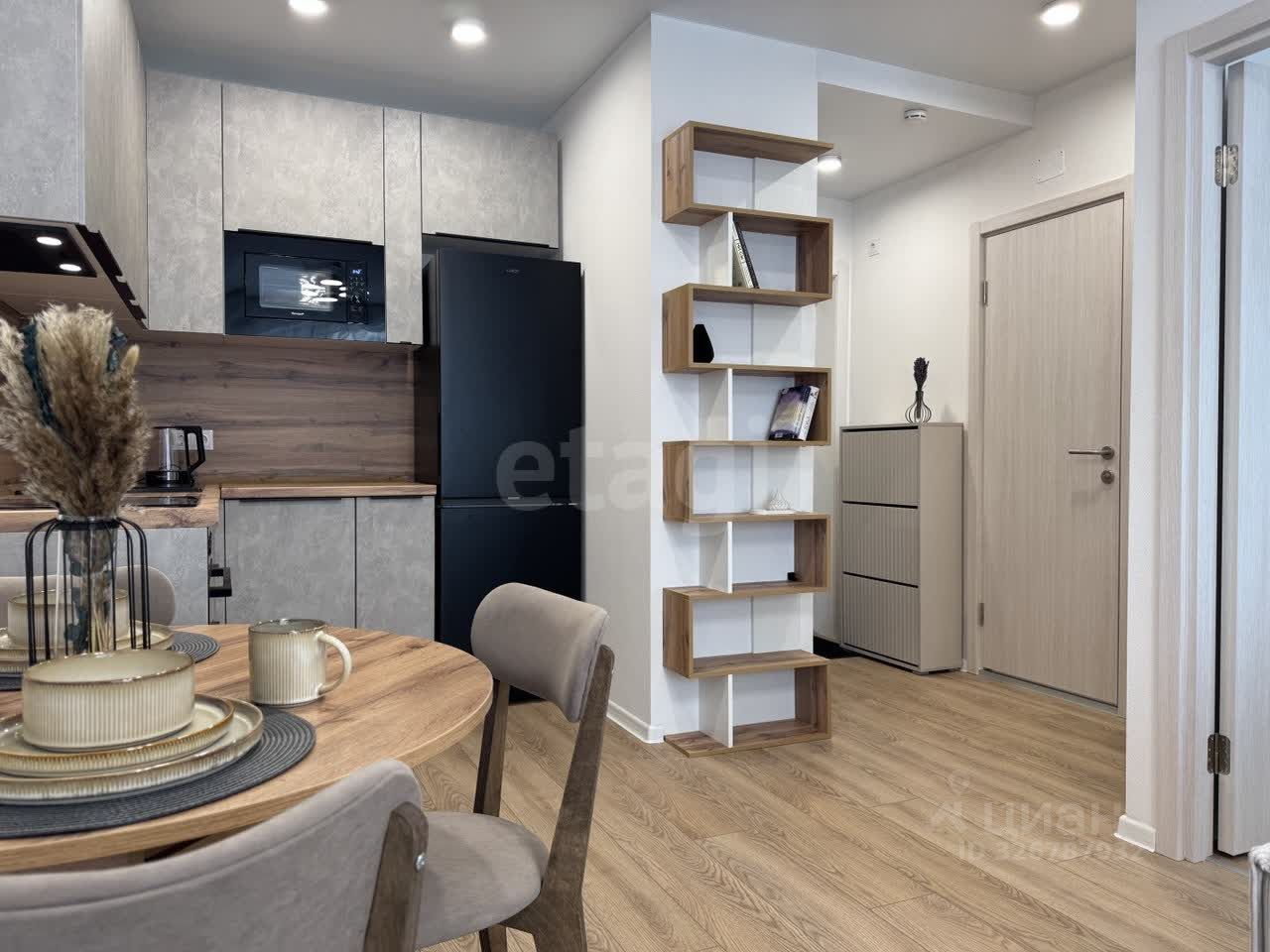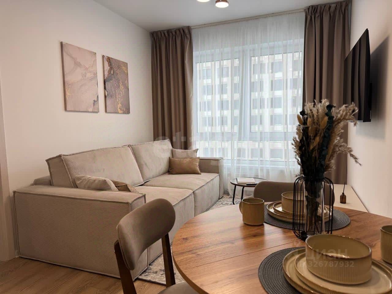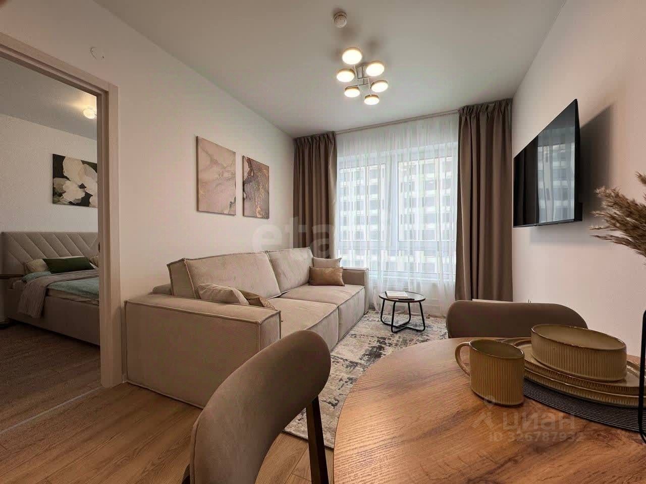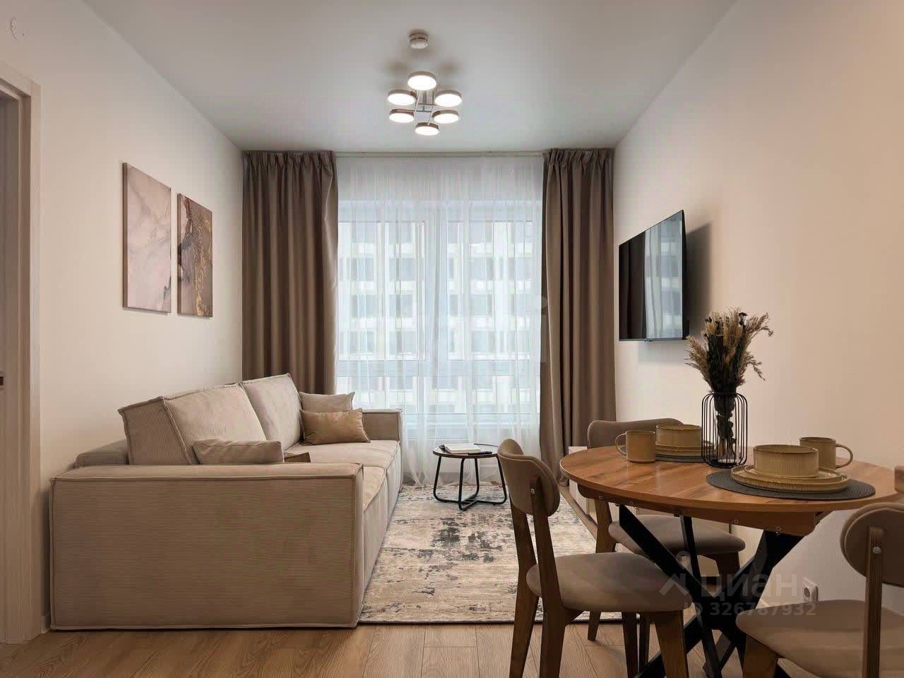 Планировка и мебель: Квартира разделена на полноценную спальню и светлую кухню-гостиную. — Спальня: Установлена двуспальная кровать с орто-основанием и подъемным механизмом, матрас ''Аскона''. Под матрасом — глубокий короб для хранения чемоданов, зимних одеял или подушек. Рядом — вместительный распашной шкаф. Свет lamplandia, шторы blackout. — Кухня-гостиная: Модульный раздвижной диван с бельевым ящиком (постельное белье и пледы будут всегда под рукой, но на виду). Обеденная зона и полноценное место для отдыха, раскладывающийся стол. Телевизор 50' smart TV. — Прихожая: Большой распашной шкаф для верхней одежды и обуви и обувница.