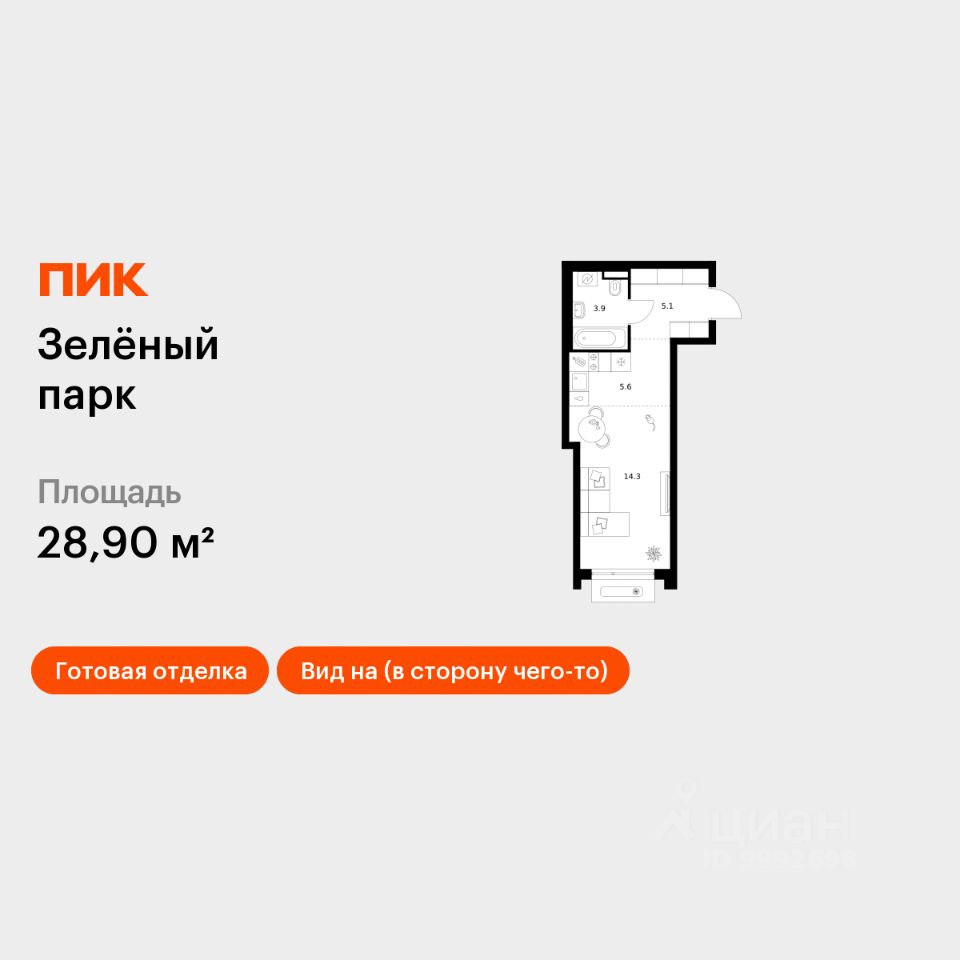 Продаётся квартира-студия площадью 28,9 кв.м на 6 этаже 13 этажного дома (Корпус 5.3, Секция 3) проекта ПИК Зелёный парк. Светлый просторный подъезд на уровне земли, функциональная планировка, большие окна, c отделкой.