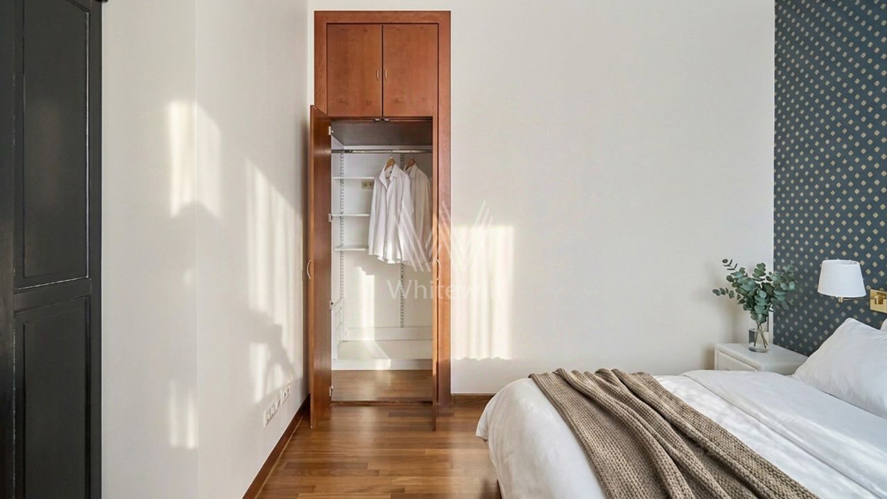 Интерьер оформлен в неоклассическом стиле. Высота потолков 3,1 метра. Планировка включает гостиную с ТВ зоной, кухню-столовую, спальню, ванную комнату, балкон и холл. Квартира меблирована и укомплектована бытовой техникой. Из окон открываются виды на особняк Зинаиды Морозовой в неоготическом стиле.