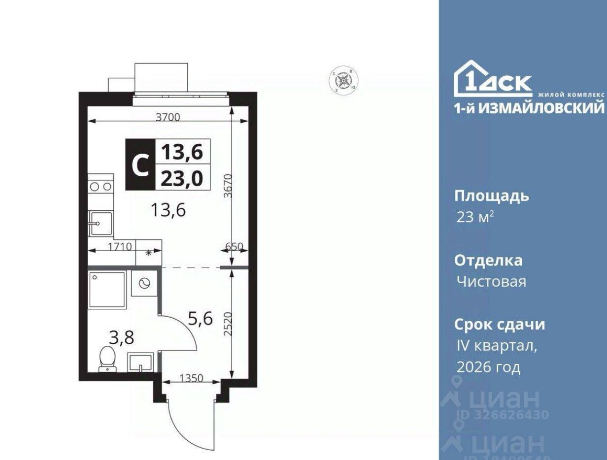 Продается квартира-студия общей площадью 23 кв.м., в ЖК ''1-ый Измайловский''. Квартира с чистовой отделкой и санузлом. Переуступка прав требования.