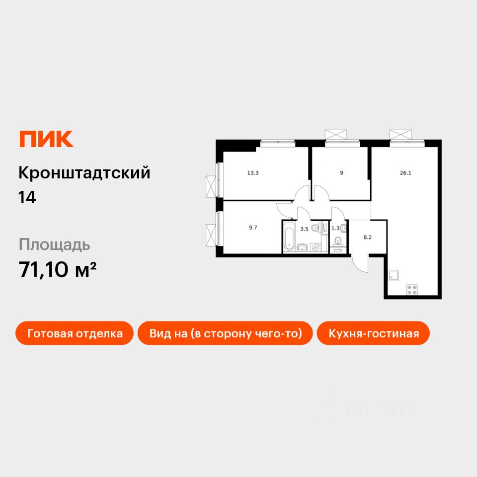 Продаётся 3-комн. квартира площадью 71,1 кв.м на 25 этаже 33 этажного дома (Корпус 1.3, Секция 2) проекта ПИК Кронштадтский 14. Светлый просторный подъезд на уровне земли, функциональная планировка, большие окна, c отделкой.