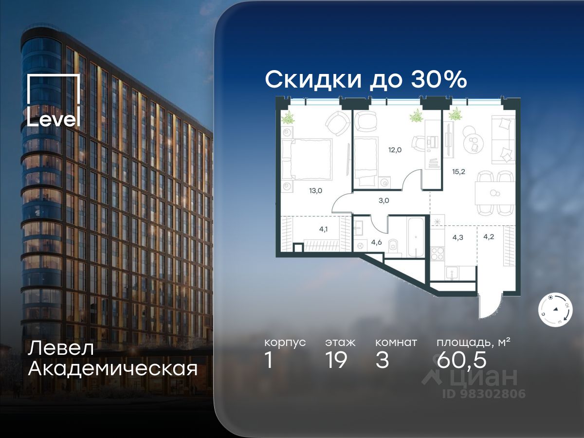 В Академическом районе продаётся 3-комнатная квартира площадью 60.50 кв.м без отделки. Квартира расположена на 19-м этаже 19-этажного жилого комплекса бизнес-класса Левел Академическая (компания Level Group).