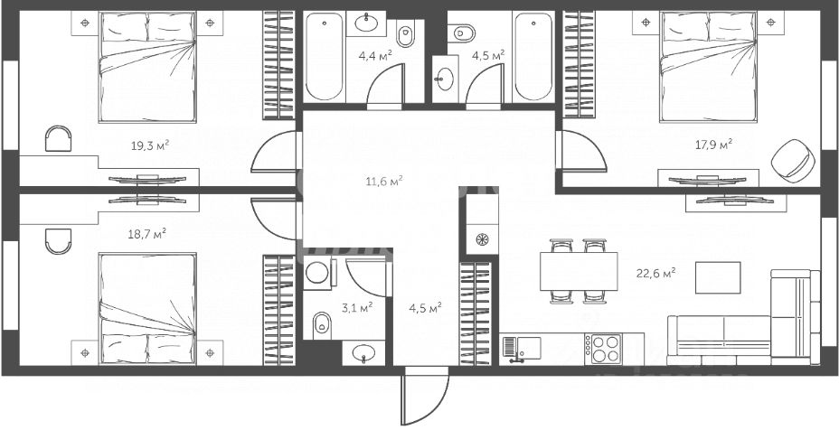 Планировка: • кухня-гостиная — 25 м² • мастер-блок: спальня, душевая, гардеробная • две комнаты свободного назначения (спальня / детская / кабинет) • второй санузел с ванной • гардеробная • постирочная • большое количество встроенных систем хранения