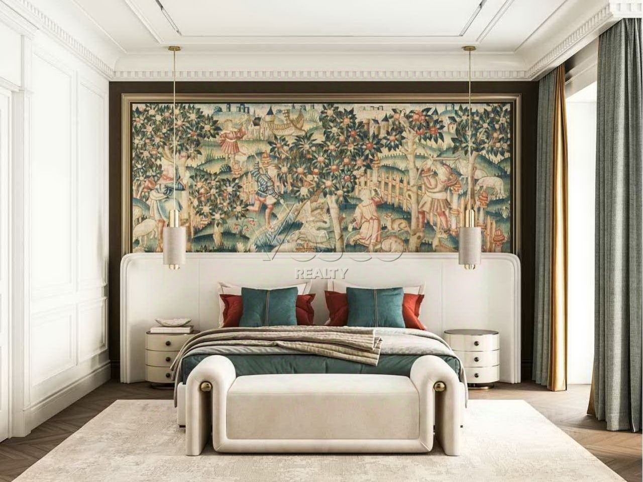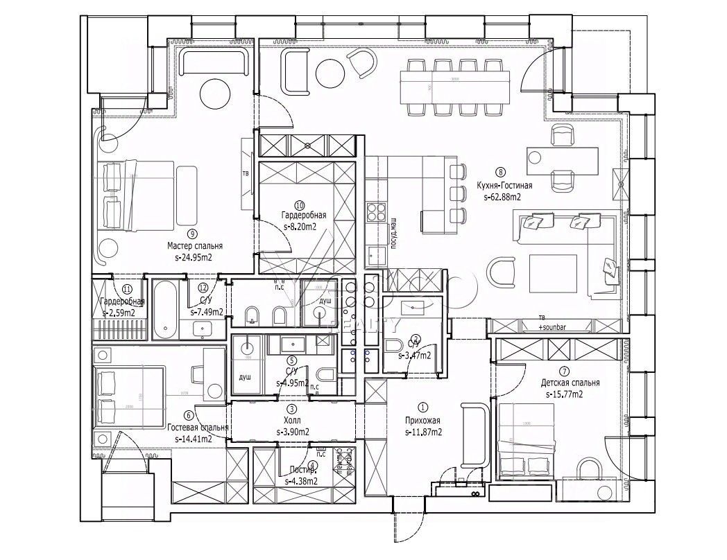 Планировка - кухня-гостиная с эркером, мастер-спальня с ванной комнатой и двумя гардеробными, детская, гостевая спальня с ванной комнатой, постирочная, прихожая с гостевым санузлом, 3 балкона.