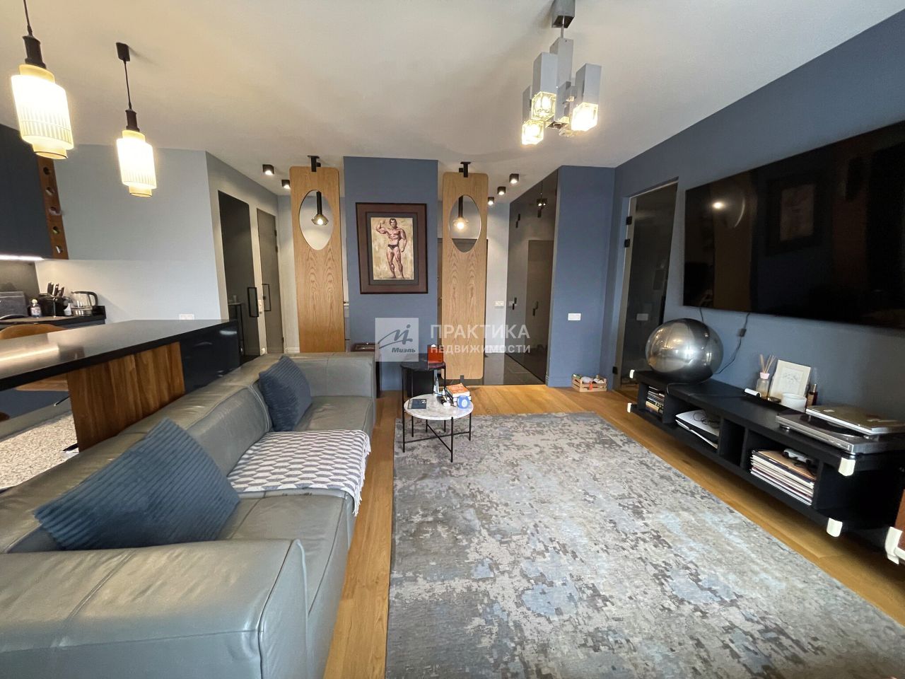 Совмещённая гостиная с кухней, прихожая, два санузла, отдельная прачечная — здесь всё продумано для удобства. Зонирование прихожей и гардеробной выполнено с помощью дизайнерских деревянных панелей, визуально расширяющих пространство. Стена в спальне расписана вручную в стиле авангарда, а стол и стеллаж в кабинете изготовлены на заказ по эскизам автора проекта.