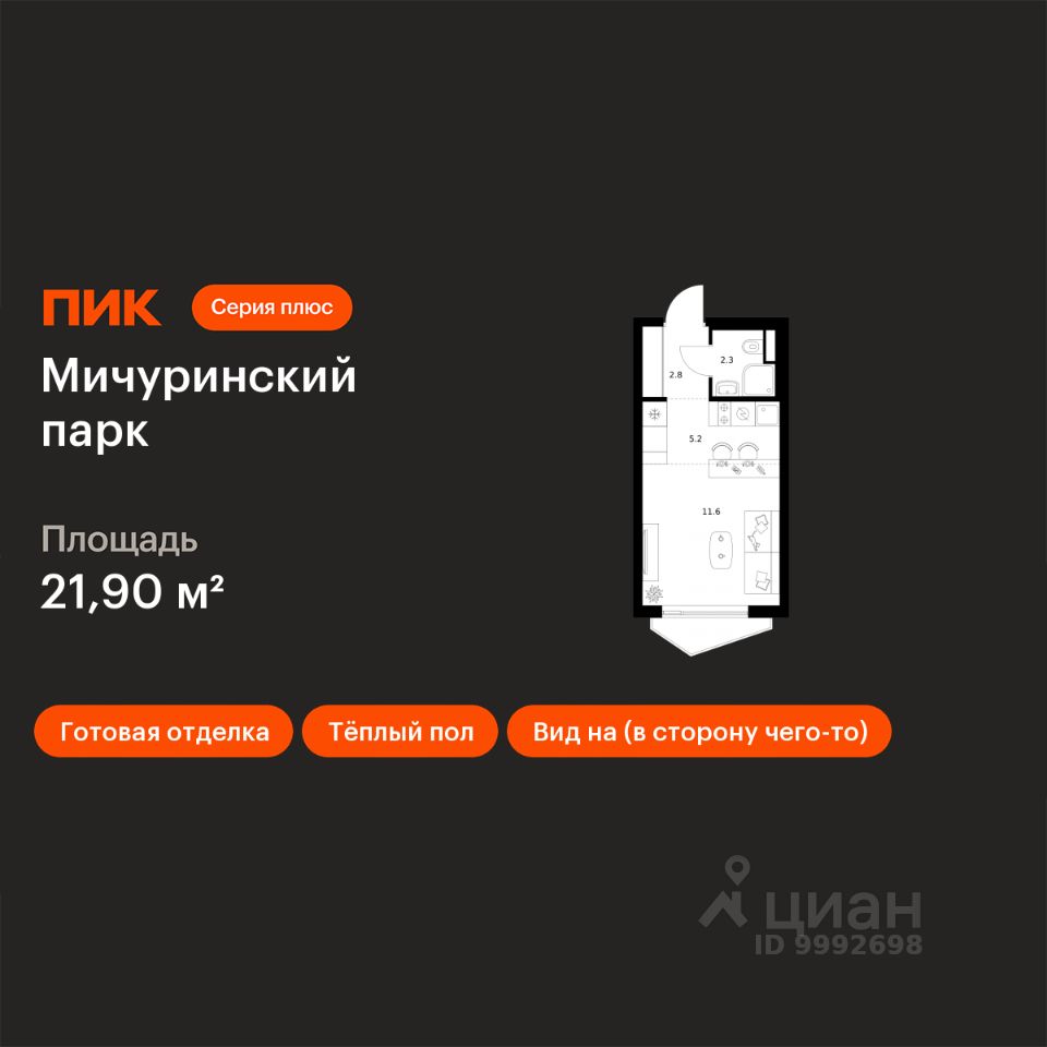 Продаётся квартира-студия площадью 21,9 кв.м на 2 этаже 24 этажного дома (Корпус 4.2, Секция 1) проекта ПИК Мичуринский парк. Светлый просторный подъезд на уровне земли, функциональная планировка, большие окна, c отделкой.