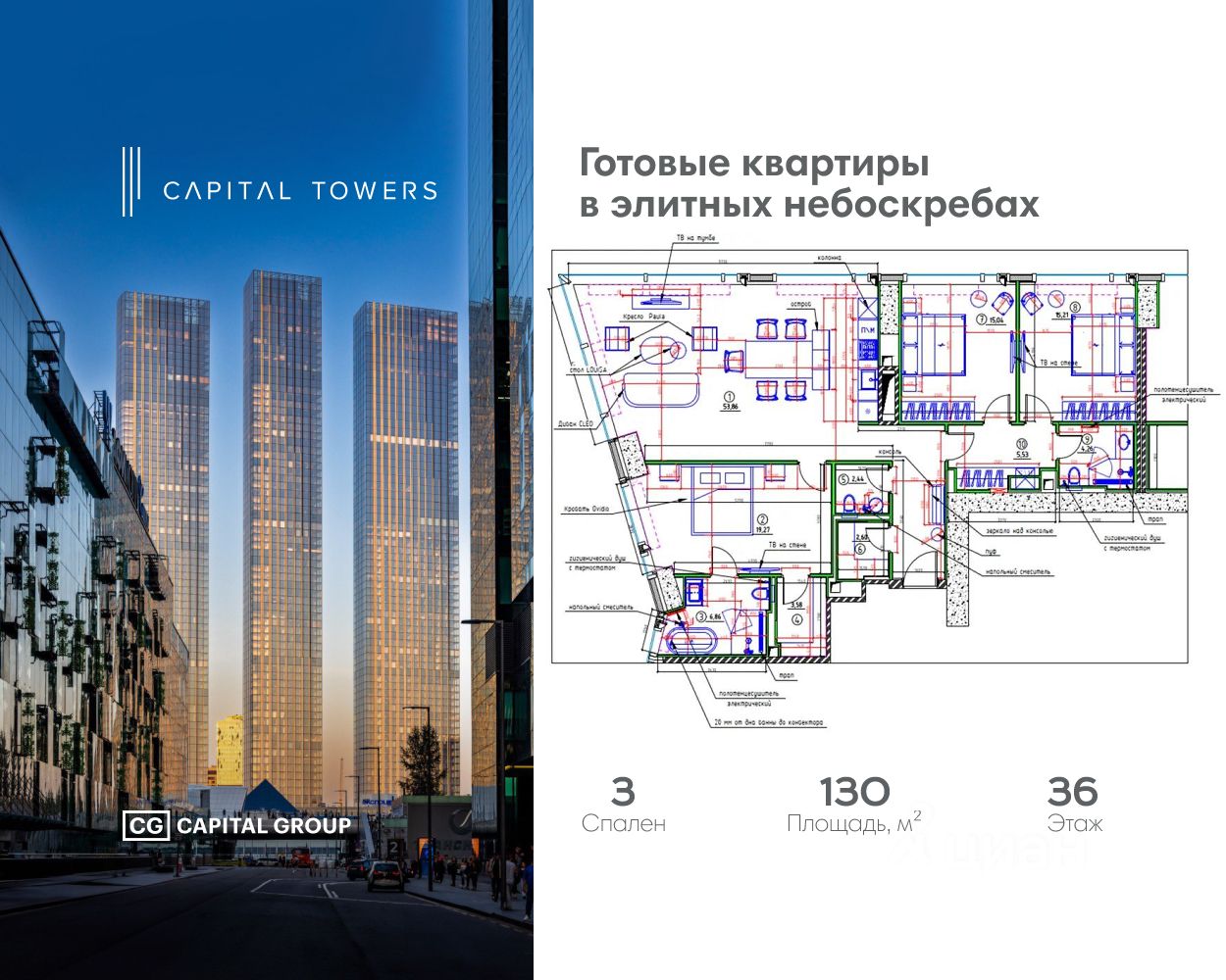 Capital Towers — это три современных жилых небоскрёба у Москва-Сити на берегу реки. Высота каждой башни — почти 300 метров, из окон открываются панорамные виды на центр Москвы, Москва-Сити, Лужники, МГУ и парк ''Красная Пресня''