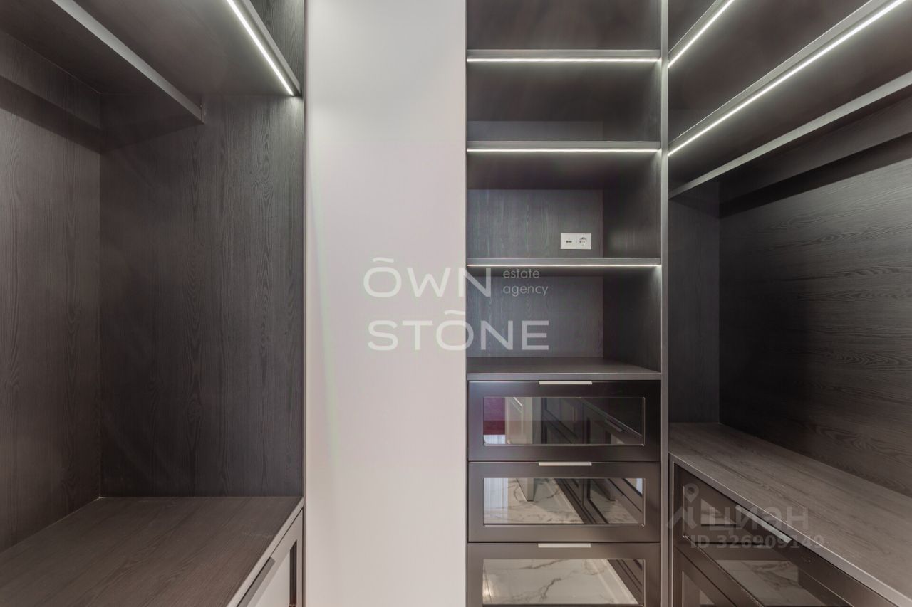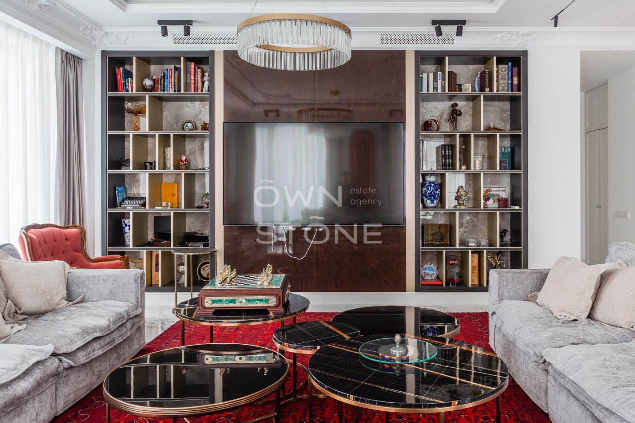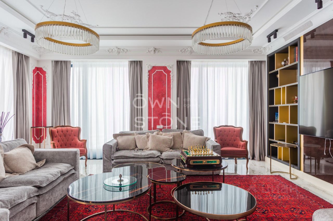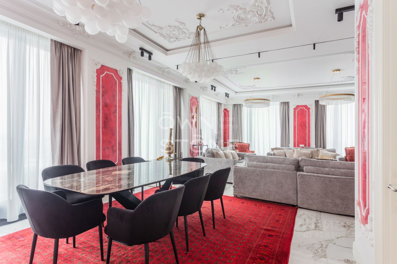 Спланирована угловая гостиная с 4 окнами и обеденной зоной, кухня, мастер-спальня со своей гардеробной и ванной комнатой, кабинет со своим c/у, гостевой санузел, холл и вторая гостевая комната. Квартира полностью меблирована и укомплектована всей необходимой премиальной техникой. Установлена система кондиционирования, стиральная, сушильная и посудомоечная машины. Из окон открывается потрясающий вид на город.