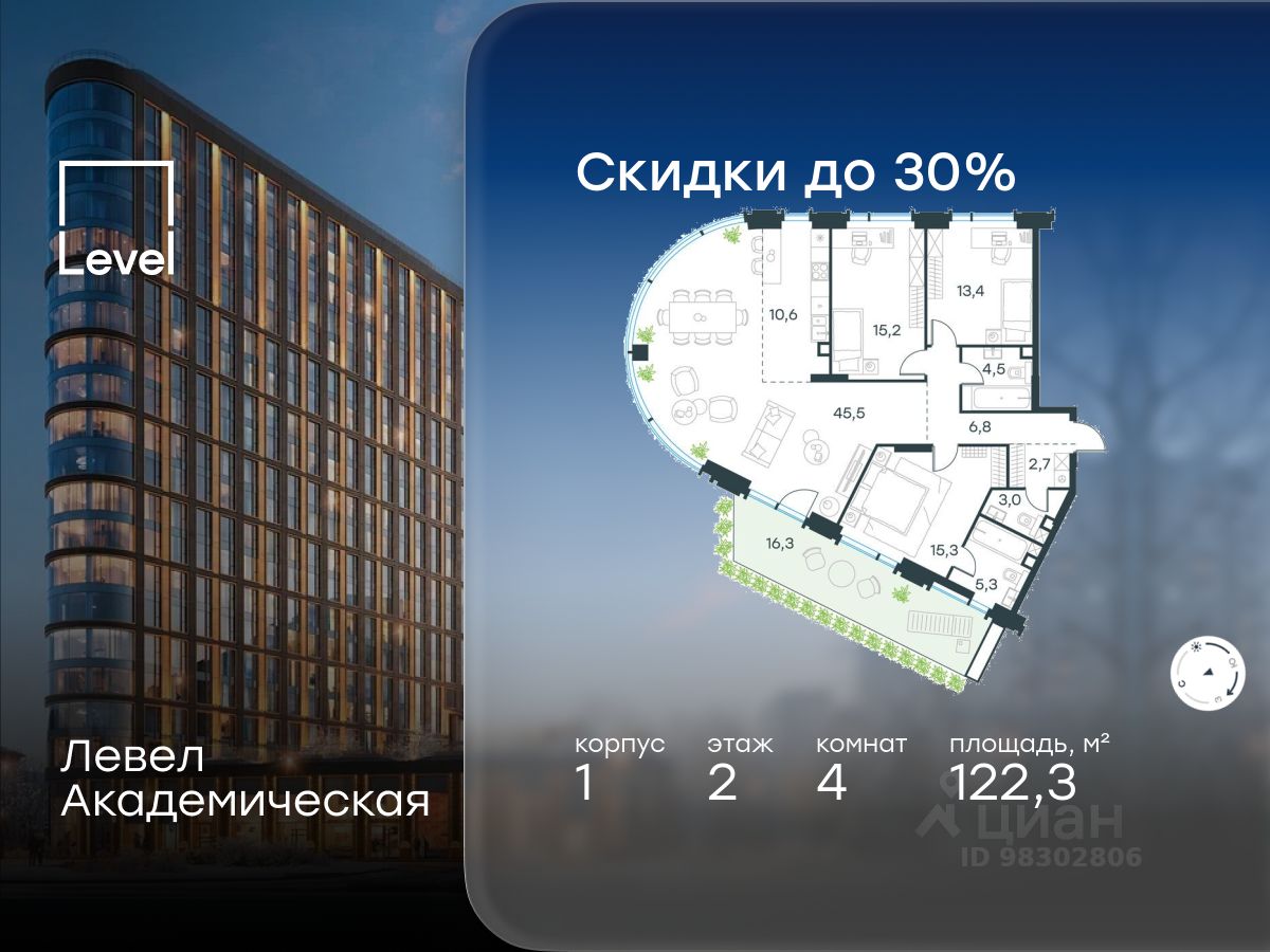 В Академическом районе продаётся 4-комнатная квартира площадью 122.30 кв.м без отделки. Квартира расположена на 2-м этаже 19-этажного жилого комплекса бизнес-класса Левел Академическая (компания Level Group).