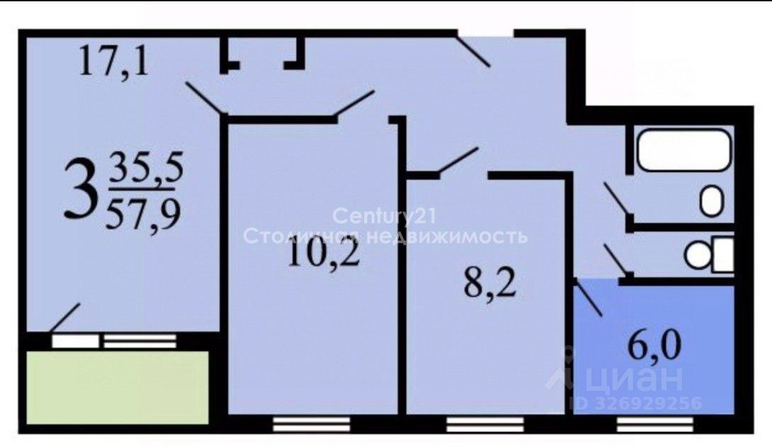 Информация об объекте: Структура комнат: три комнаты, изолированные Общая площадь: 57.9 кв.м Жилая площадь: 35.5 кв.м Площадь кухни: 6 кв.м Площадь комнат: 10.2 + 8.2 + 17.1 кв.