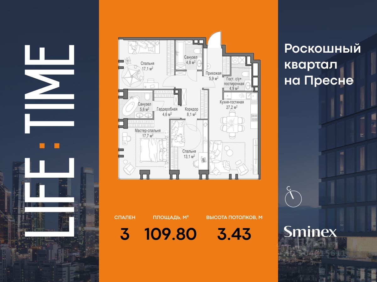 Life Time - роскошный современный квартал на Пресне, в наиболее быстро растущем премиальном районе ЦАО. Его насыщенная инфраструктура и выгодное расположение дарят время для жизни. Вы больше не тратите его на дорогу или ожидание, при этом ни в чём себе не отказывая. На территории предусмотрено всё для комфортной жизни: • двор-парк площадью 1,8 гектара с прудом и фонтанами, • Clubhouse - инфраструктурный центр в отдельном здании с исчерпывающими возможностями для спорта, отдыха и досуга только для жителей, • спортивная инфраструктура на улице и в помещении, в том числе бассейн длиной 25 метров, хот-таб, хаммам, сауна, бьюти-зона, • клубная гостиная с террасой, • всё для развития и досуга детей любого возраста, в том числе детский сад и школа. Life Time находится в центре сложившегося премиального района, в окружении многочисленных парков. Удобная транспортная доступность и прямой выезд на Звенигородское шоссе позволяют без проблем добраться до Садового кольца и Москва-Сити. Архитектурный стиль квартала - роскошный минимализм. Дома десятилетиями будут выглядеть современно.