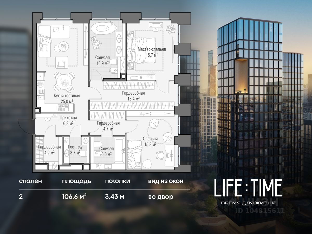 Life Time - роскошный современный квартал на Пресне, в наиболее быстро растущем премиальном районе ЦАО. Его насыщенная инфраструктура и выгодное расположение дарят время для жизни. Вы больше не тратите его на дорогу или ожидание, при этом ни в чём себе не отказывая. На территории предусмотрено всё для комфортной жизни: • двор-парк площадью 1,8 гектара с прудом и фонтанами, • Clubhouse - инфраструктурный центр в отдельном здании с исчерпывающими возможностями для спорта, отдыха и досуга только для жителей, • спортивная инфраструктура на улице и в помещении, в том числе бассейн длиной 25 метров, хот-таб, хаммам, сауна, бьюти-зона, • клубная гостиная с террасой, • всё для развития и досуга детей любого возраста, в том числе детский сад и школа. Life Time находится в центре сложившегося премиального района, в окружении многочисленных парков. Удобная транспортная доступность и прямой выезд на Звенигородское шоссе позволяют без проблем добраться до Садового кольца и Москва-Сити. Архитектурный стиль квартала - роскошный минимализм. Дома десятилетиями будут выглядеть современно. В Life Time представлен широкий выбор как квартир, так и особых форматов: двухэтажные пентхаусы с каминами и террасами, скай-виллы.