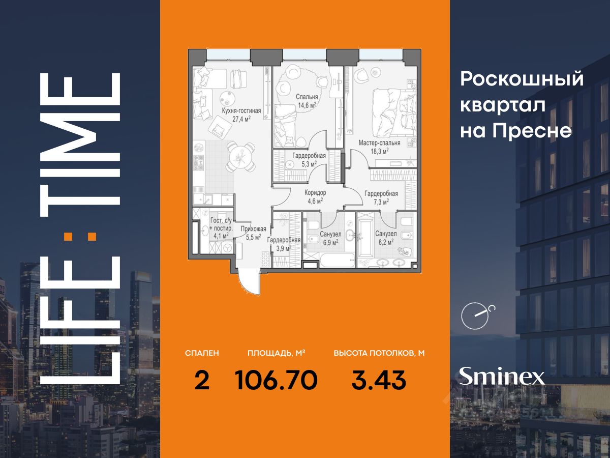 Life Time - роскошный современный квартал на Пресне, в наиболее быстро растущем премиальном районе ЦАО. Его насыщенная инфраструктура и выгодное расположение дарят время для жизни. Вы больше не тратите его на дорогу или ожидание, при этом ни в чём себе не отказывая. На территории предусмотрено всё для комфортной жизни: • двор-парк площадью 1,8 гектара с прудом и фонтанами, • Clubhouse - инфраструктурный центр в отдельном здании с исчерпывающими возможностями для спорта, отдыха и досуга только для жителей, • спортивная инфраструктура на улице и в помещении, в том числе бассейн длиной 25 метров, хот-таб, хаммам, сауна, бьюти-зона, • клубная гостиная с террасой, • всё для развития и досуга детей любого возраста, в том числе детский сад и школа. Life Time находится в центре сложившегося премиального района, в окружении многочисленных парков. Удобная транспортная доступность и прямой выезд на Звенигородское шоссе позволяют без проблем добраться до Садового кольца и Москва-Сити. Архитектурный стиль квартала - роскошный минимализм. Дома десятилетиями будут выглядеть современно. В Life Time представлен широкий выбор как квартир, так и особых форматов: двухэтажные пентхаусы с каминами и террасами, скай-виллы.