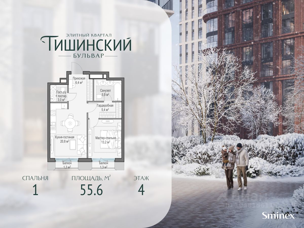 В продаже 1-комнатная квартира квартира в элитном квартале ''Тишинский бульвар''. Общая площадь квартиры - 55.60 кв.м. Этаж 4 из 7. Корпус К5С4.