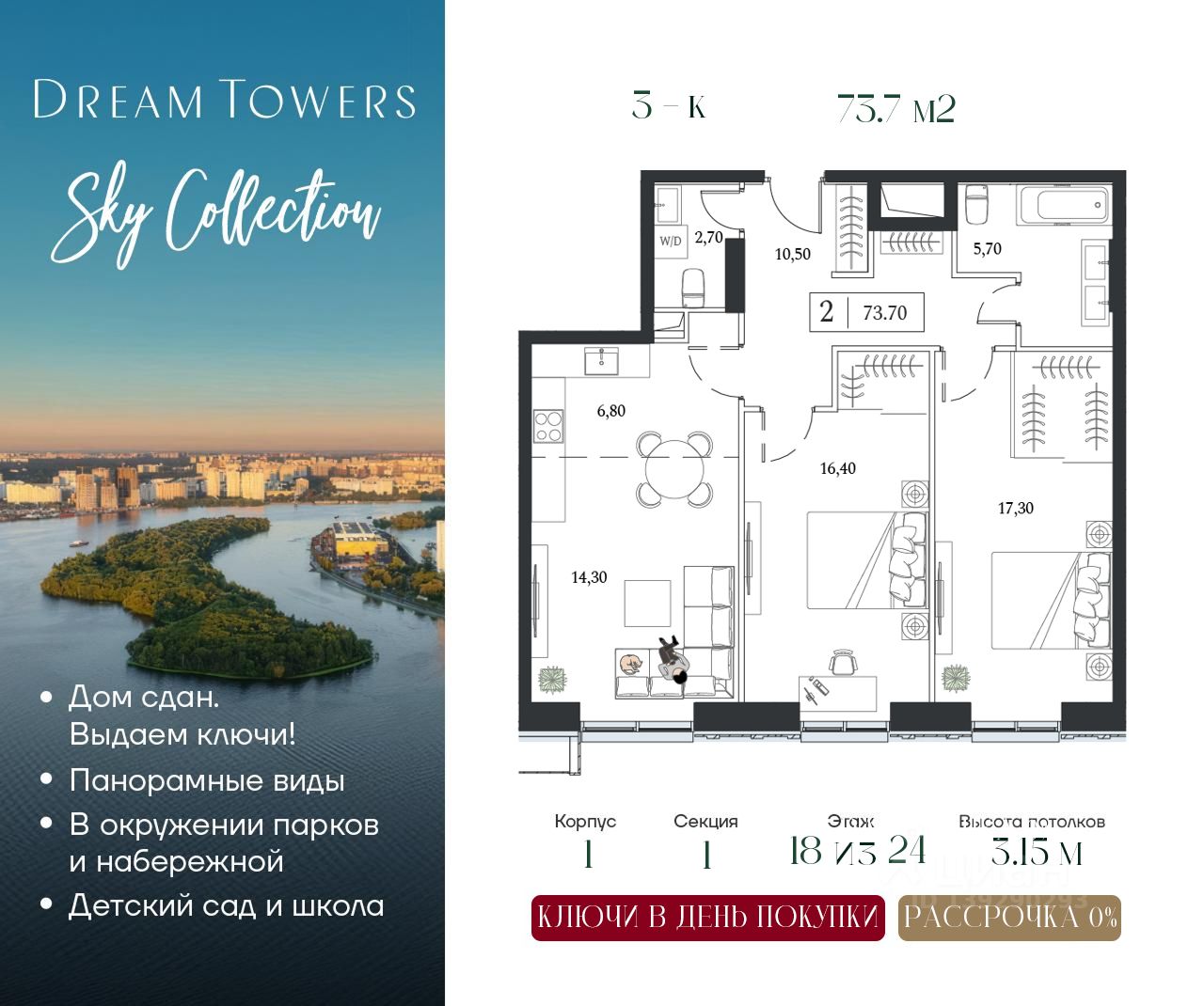 ЖК Dream Towers — проект премиум-класса в окружении парков и набережной, с полностью готовой инфраструктурой для комфортной жизни и отдыха.