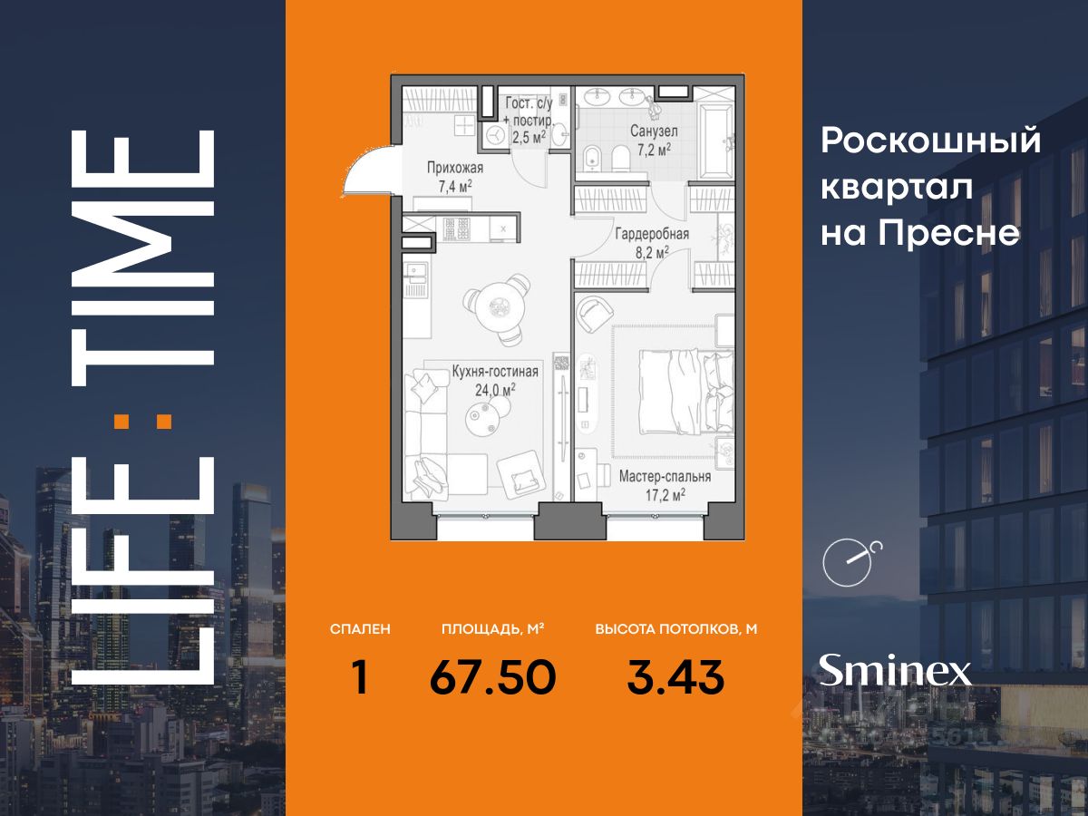 Life Time - роскошный современный квартал на Пресне, в наиболее быстро растущем премиальном районе ЦАО. Его насыщенная инфраструктура и выгодное расположение дарят время для жизни. Вы больше не тратите его на дорогу или ожидание, при этом ни в чём себе не отказывая. На территории предусмотрено всё для комфортной жизни: • двор-парк площадью 1,8 гектара с прудом и фонтанами, • Clubhouse - инфраструктурный центр в отдельном здании с исчерпывающими возможностями для спорта, отдыха и досуга только для жителей, • спортивная инфраструктура на улице и в помещении, в том числе бассейн длиной 25 метров, хот-таб, хаммам, сауна, бьюти-зона, • клубная гостиная с террасой, • всё для развития и досуга детей любого возраста, в том числе детский сад и школа. Life Time находится в центре сложившегося премиального района, в окружении многочисленных парков. Удобная транспортная доступность и прямой выезд на Звенигородское шоссе позволяют без проблем добраться до Садового кольца и Москва-Сити. Архитектурный стиль квартала - роскошный минимализм. Дома десятилетиями будут выглядеть современно. В Life Time представлен широкий выбор как квартир, так и особых форматов: двухэтажные пентхаусы с каминами и террасами, скай-виллы.