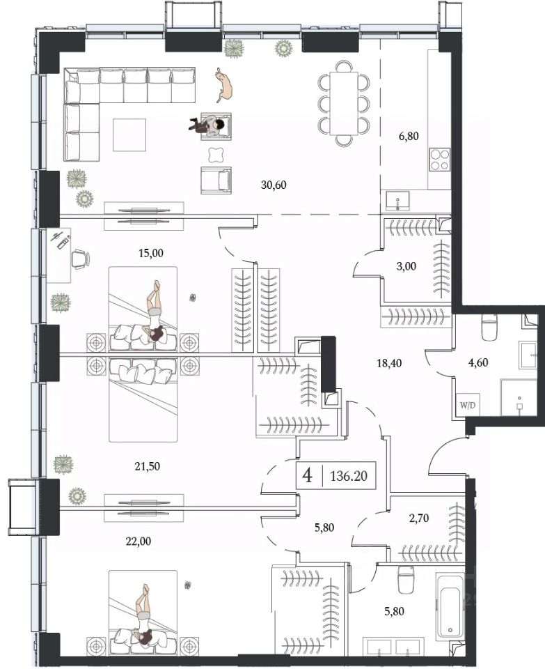 Продаётся 4-квартира на 20 этаже 24-этажного дома (2 корпус). Общая площадь: 136.2 кв.м. Высота потолков от 3.15 м.