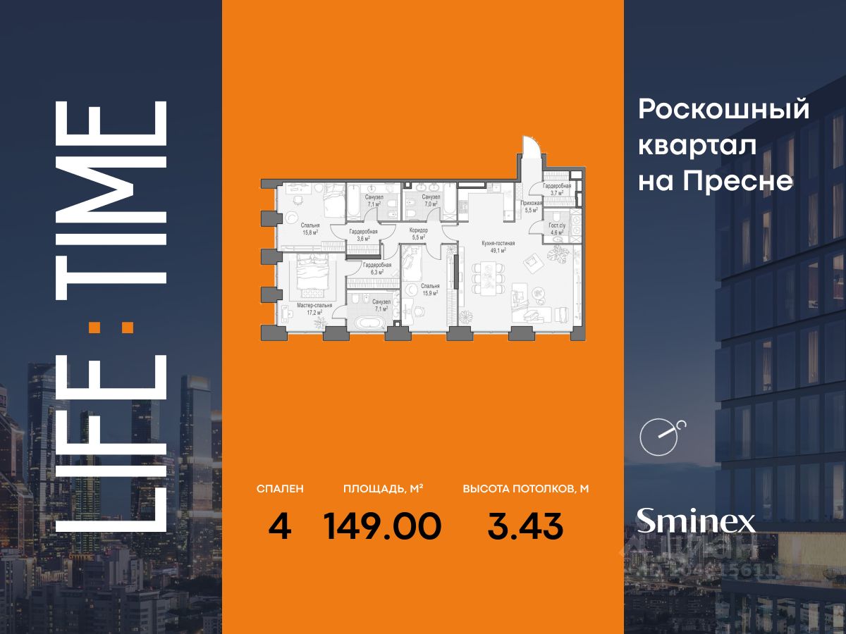 Life Time - роскошный современный квартал на Пресне, в наиболее быстро растущем премиальном районе ЦАО. Его насыщенная инфраструктура и выгодное расположение дарят время для жизни. Вы больше не тратите его на дорогу или ожидание, при этом ни в чём себе не отказывая. На территории предусмотрено всё для комфортной жизни: • двор-парк площадью 1,8 гектара с прудом и фонтанами, • Clubhouse - инфраструктурный центр в отдельном здании с исчерпывающими возможностями для спорта, отдыха и досуга только для жителей, • спортивная инфраструктура на улице и в помещении, в том числе бассейн длиной 25 метров, хот-таб, хаммам, сауна, бьюти-зона, • клубная гостиная с террасой, • всё для развития и досуга детей любого возраста, в том числе детский сад и школа. Life Time находится в центре сложившегося премиального района, в окружении многочисленных парков. Удобная транспортная доступность и прямой выезд на Звенигородское шоссе позволяют без проблем добраться до Садового кольца и Москва-Сити. Архитектурный стиль квартала - роскошный минимализм. Дома десятилетиями будут выглядеть современно. В Life Time представлен широкий выбор как квартир, так и особых форматов: двухэтажные пентхаусы с каминами и террасами, скай-виллы.